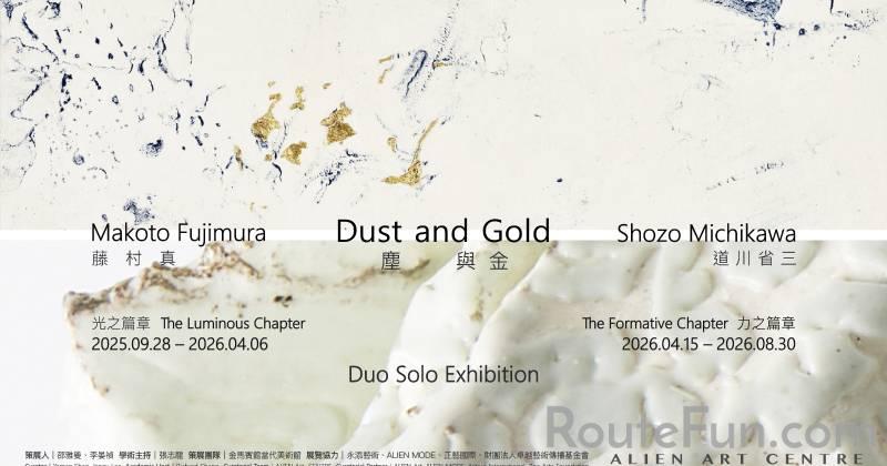 《Dust and Gold 塵與金》是當代抽象表現主義藝術家藤村真與陶藝雕塑家道川省三首度在台灣的大型展出,展件橫跨 1992-2025,涵蓋繪畫、聲音裝置與陶藝雕塑。由館長邵雅曼發起兼策展,邀請獨立策展人李晏禎共同策劃、藝術史學家張志龍擔任學術主持,展期分為兩部曲 ——《光之篇章》2025.09.28 (日) – 2026.04.06 (一) 及《力之篇章》2026.04.15 (三) – 2026.08.30 (日) ;《光之篇章》邀請觀者從「光如何誕生」看見修復的可能,《力之篇章》則從「力如何成形」引領觀者探索作品背後的手勢與時間的姿態;藤村真以礦物與金箔的緩時層疊,回應修復與希望;道川省三以陶土扭切與火痕,呈現大地勁道與無常之美。展覽下半場《力之篇章》的開場行動,更將由舞踏藝術家胡嘉以舞踏導入「身體慢觀」的視角,在材質、身體與時間的對話中,讀取塵與金的內涵 —— 從裂縫修復的視覺語彙昇華至文化修復的實作精神。
