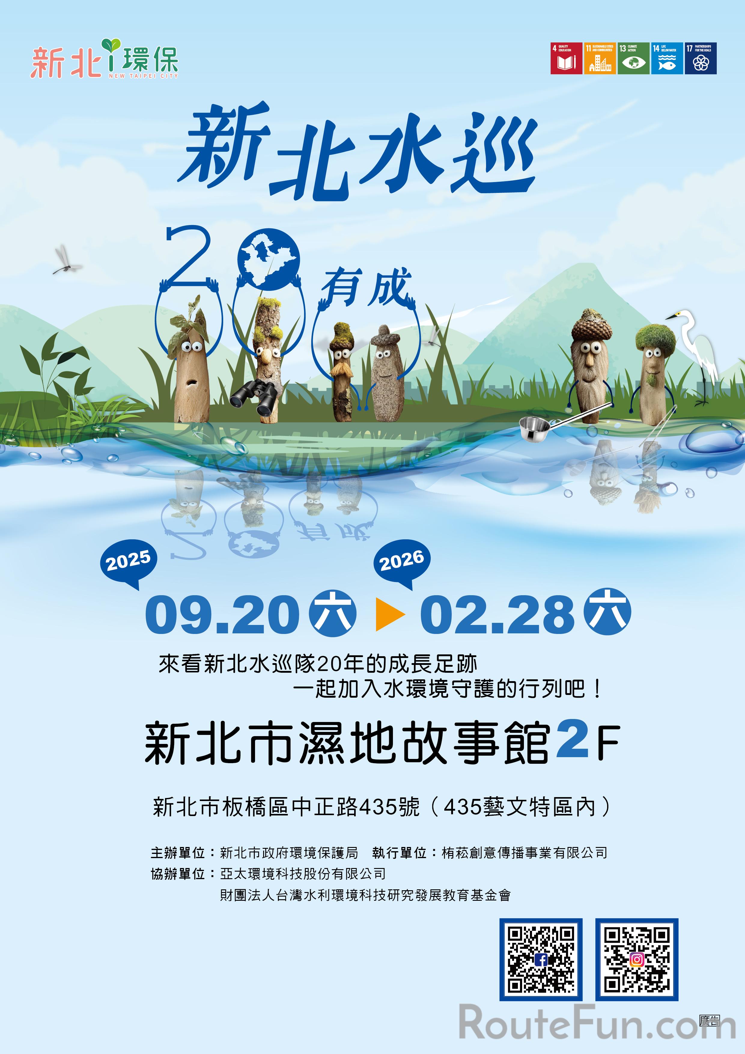 新北市自94年起推動成立水環境巡守隊,今(114)年迎來20周年重要里程碑,新北環保局特別在板橋435藝文特區內的濕地故事館推出《新北水巡 20有成》主題特展,展覽回顧水域巡守與清理、生態調查、河川走讀,展示公私協力與環境教育等成果,共同見證這段珍貴的水環境守護歷程。現場展示環境檢測工具、水環境巡守隊裝備,讓民眾瞭解巡守工作,並以漂流木、自然材及回收物打造的「水巡小木人」裝扮成水巡隊中不同的角色引導觀展,搭配自然童趣造景設計,讓大家在輕鬆愉快的氛圍中重新連結對土地的情感與環境責任。完整介紹大漢溪流域人工濕地之人文、自然及生態資源外,也特別在濕地故事館2樓展出環保局漳和濕地介紹。9/20(六) 開幕活動10:00 特展開幕+表揚典禮11:30-15:00 濕地故事館外圍廣場,有攤位、闖關遊戲活動。週一至週五 開館時間為上午9點至下午5點。週六至週日 開館時間為上午9點至下午5點30分。休館時間:每月第一個星期一,其他休館日請參考濕地故事館公告。