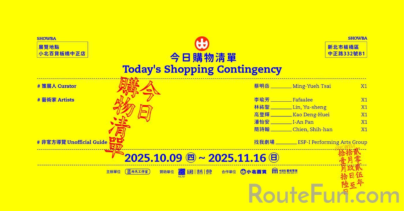 《今日購物清單》中,五位藝術家結合百貨商品與商場空間,在商品縫隙之中埋入意外事件。林祐聖的《當便利成為一種單位》思考便利服務如何重塑了生活,於是開始「量測便利性」,並在商品促銷區進行成果發表;簡詩翰在《這就是一本型錄》中,使用五大類別的小北商品為變裝皇后「漢娜」製作六組散佈於商場的代言形象,反問代言形象究竟在販售什麼;高登輝的《不為模模糊糊的未來擔憂,只為清清楚楚的現在努力》則將商場化為「靜物畫教室」,讓商品從消費對象轉換成繪畫中被凝視的靜物;李瑜芳在《家常便飯》中讓「功能性物件」承載繪畫,在效率生活的間隙填入了日常切片;潘怡安的《深處》重新轉譯滯銷商品,在銷售系統外,為物品尋得低語的可能性;找我劇場則透過語音引導觀眾遊走於商場,在《非官方導覽》中日常商品逐漸成為情感的容器。