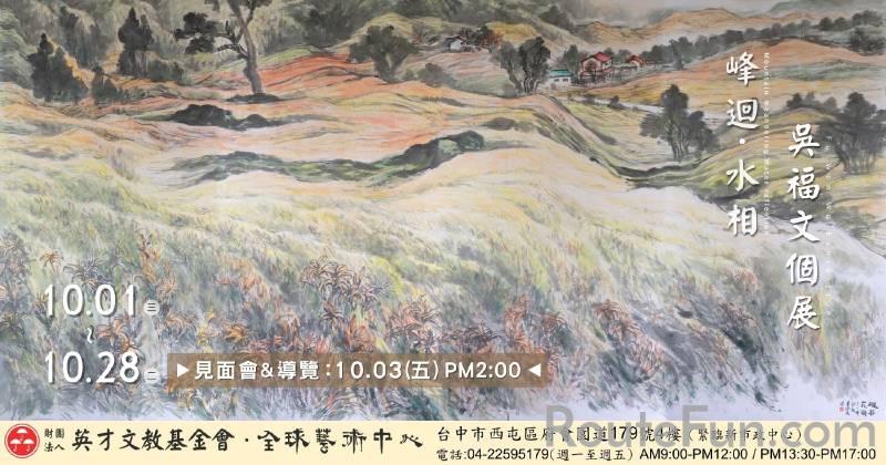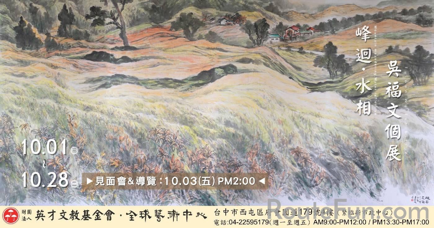 「峰迴.水相」吳福文個展訂於2025年10月1日至10月28日(周一至周五/例假日休館)AM9:00~PM12:00/PM13:30~PM17:00在財團法人英才文教基金會全球藝術中心展出,見面會和導覽訂於10月3日(週五)下午2:00舉行,展出吳福文老師近年來遊走寶島的每一次驚嘆和體悟,展示作品五十餘件,呈現出近年來畫家致力於藝術形式、造型結構與媒材上的突破,蒼勁有力的筆法、嶄新的畫面感共同渲染出水墨畫的新境地。