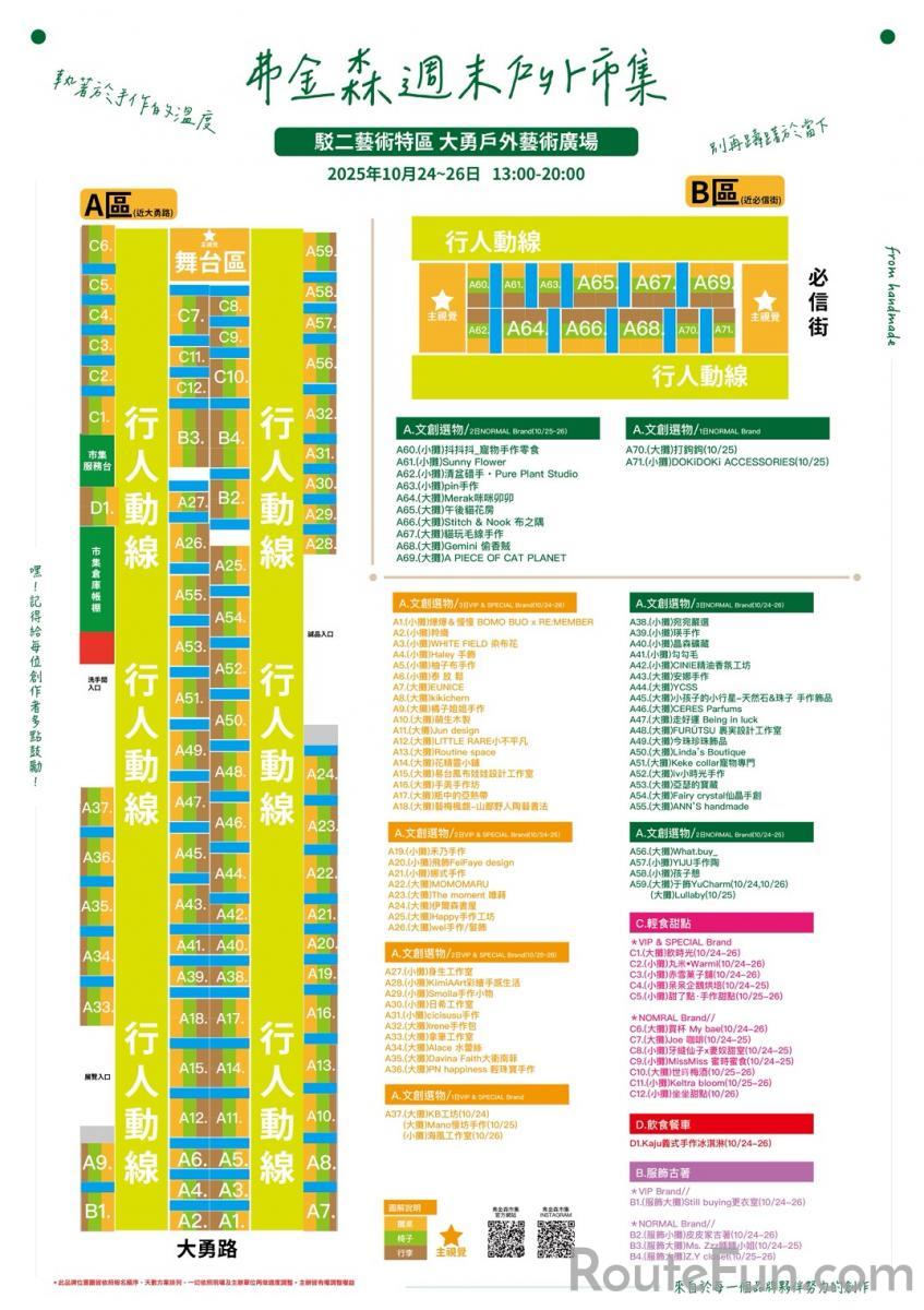 弗金 森 市集將於2025年10月24日至10月26日在駁二藝術特區大勇區藝術廣場舉行,時間為每日13:00至20:00。市集匯集眾多品牌,每日參與品牌以現場為主,若因天氣因素,主辦方有權延後或暫停舉辦。現場演出活動可能因天氣或人潮而提前或延長,若天氣不佳,主辦方有權延後或中止演出。