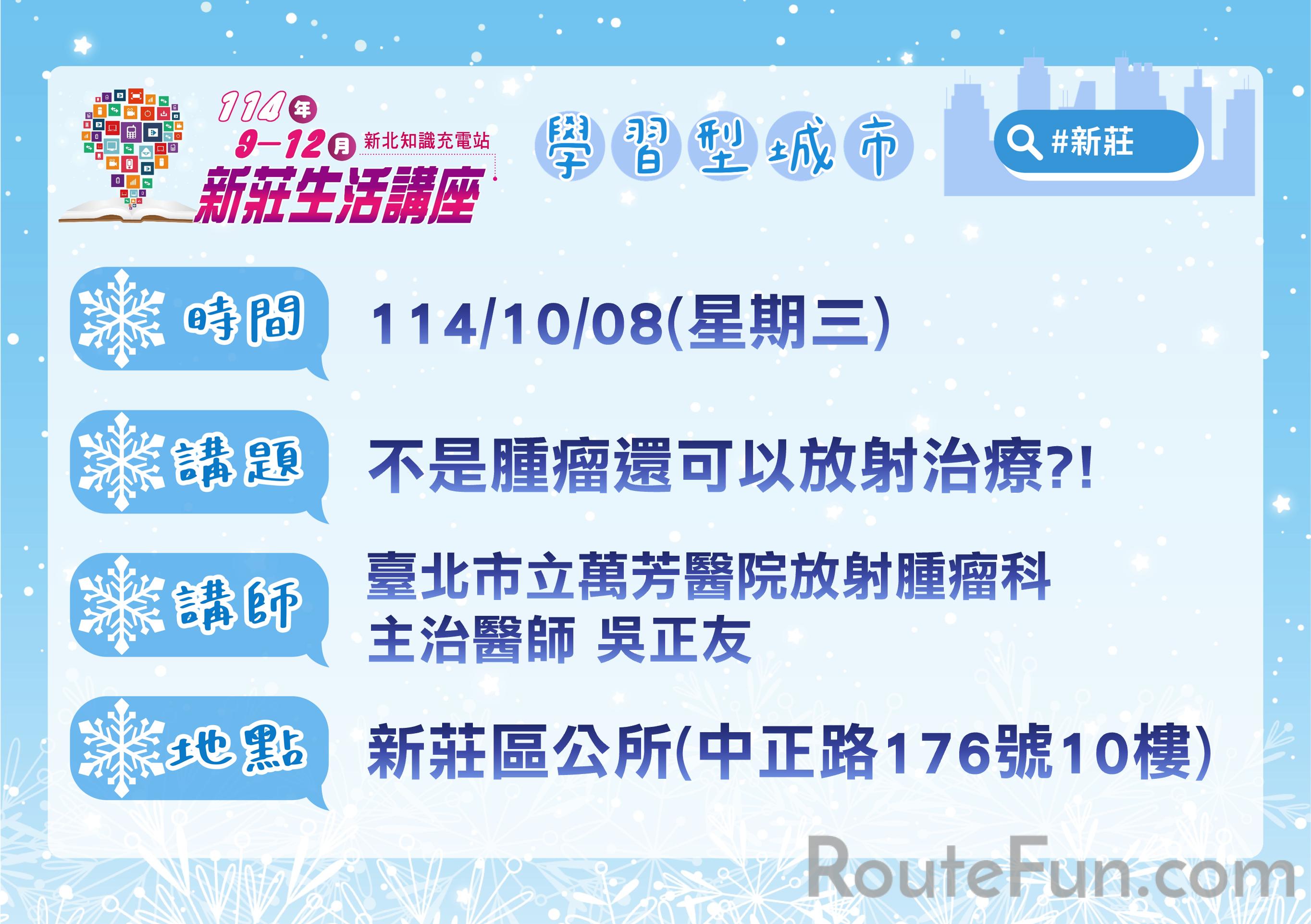10/08 (三)晚上7:00於新莊區公所10樓大禮堂(新莊區中正路176號),邀請臺北市立萬芳醫院放射腫瘤科主治醫師吳正友,以「不是腫瘤還可以放射治療?!」為題分享。此次講座將從腫瘤放射治療的基礎談起,並重點介紹放射治療在非腫瘤性疾病的應用,包括蟹足腫與退化性關節炎等案例。講師將說明治療適應症、成效與安全性,並分享臨床經驗與治療流程,協助聽眾全面認識非腫瘤性放射治療。本講座採自由入場,歡迎踴躍參加。