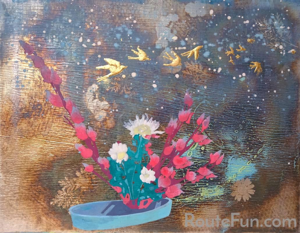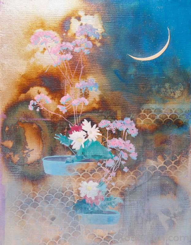 在這無聲的透明容器中,李怡萱輕輕擺放著她的片段 —— 一些從泥土裡長出來的記憶,一些從童年溢出的光影。此次創作延續著過去對家的描繪與符號的探索。在許多詩歌中,母親總與月亮相似 —— 溫柔、陰柔、慈愛。對她來說,母親就像月亮,時而明亮、時而幽暗,隨時間轉變著面貌。而她希望透過月亮的象徵,來記錄對母親的祝福與時間的流逝 —— 因為生命本就多變無常。作品也融入了對家人關係的觀察,從植物描繪到物件移情,刻畫父親對母親態度的轉變 —— 從年輕時不理解,到老年時的互相扶持。這些具有回憶的片段,成了生活中默默流淌的記錄,也承載著那些晦澀難言的愛與回憶。然而,這些創作既不是純然的再現,而是介於真實與想像之間,被一層透明的時間薄膜輕輕包覆 —— 正如「她的透明容器」,既清晰,又難以一眼看清。