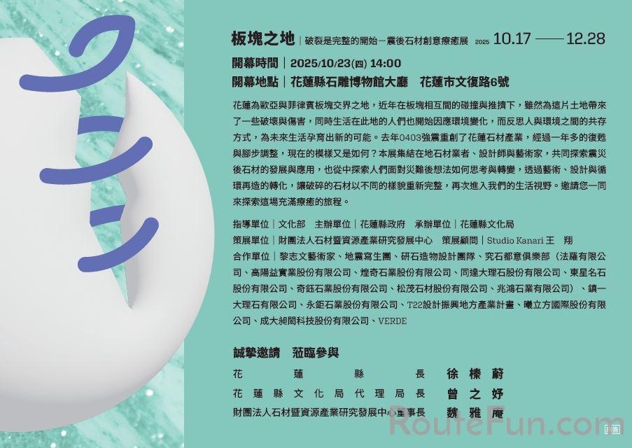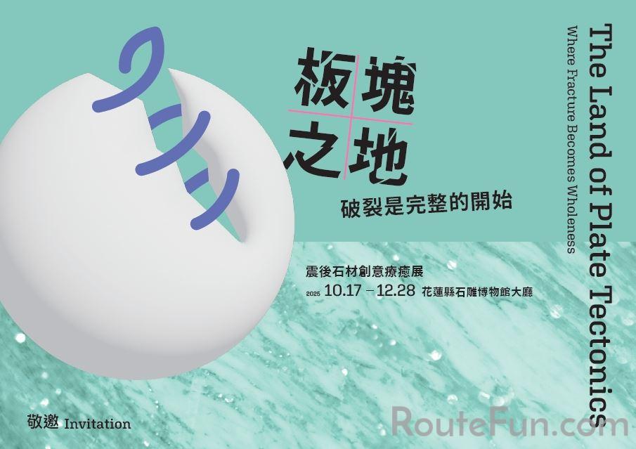 《板塊之地-破裂是完整的開始》震後石材創意療癒展將於 2025 年 10 月 17 日至 12 月 28 日於花蓮縣石雕博物館登場!由文化部指導、花蓮縣政府主辦、花蓮縣文化局承辦、財團法人石材暨資源產業研究發展中心策畫,以「破裂即新生」為核心概念,集結藝術家、設計師與在地石材業者,透過藝術、設計與科技等多重面向,探討震後花蓮石材產業的再生與重構,帶領你我穿越震動,讓風景在破碎間重生,展現生命持續延展的力量。