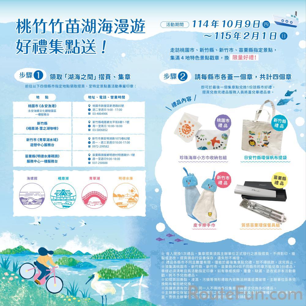 請每縣市於指定景點各蓋一個章(指定景點:桃園市永安漁港、新竹縣峨眉湖、新竹市青草湖、苗栗縣明德水庫),共計四個章,即可於最後一個集章點兌換1份該縣市提供之精美好禮,摺頁兌換完禮品服務人員將蓋兌畢禮品章。