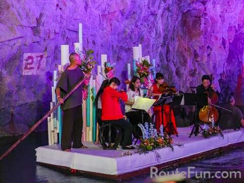 翟山坑道為花崗岩開挖而成,成為一個天然的音箱,還有海浪自然的聲音。因此我們特別利用坑道的水道做為表演舞臺場域,舉辦金門坑 道音樂節表演,推廣軍事史蹟活化再利用觀念,並以軟性的音樂宣揚 和平理念。