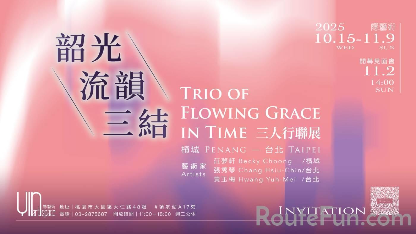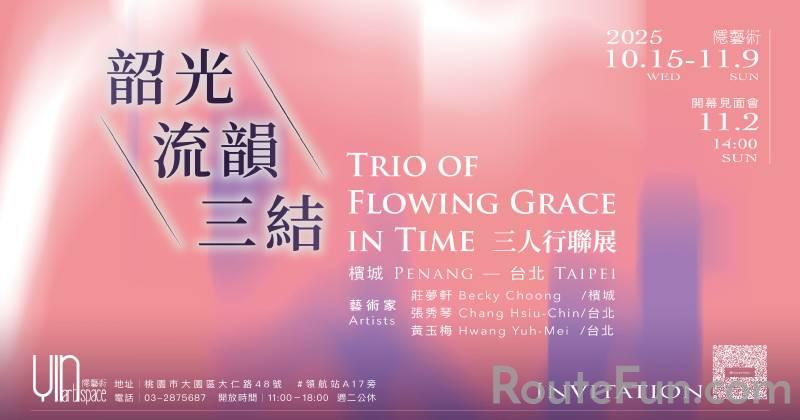 《韶光流韵三结》Trio of Flowing Grace in Time 不同時段畢業的三位師大藝術家女校友,因藝術而結緣。三人行三人三藝,她們在韶光中以藝術結緣,作品意象裡有花鳥的典雅、柔美,人物畫熱愛生命溫馨與和諧愛意或禪意和深遠的山山水水….。聚樂裡約定從心出發,彙聚三種藝術風貌格如三種色彩交織,閃耀光芒。三位女藝術家來自不同地方與國度,有臺北的和馬來西亞檳城州的,應用各自文化媒材風格,展現一場多元文化當代藝術表現的融合之美。