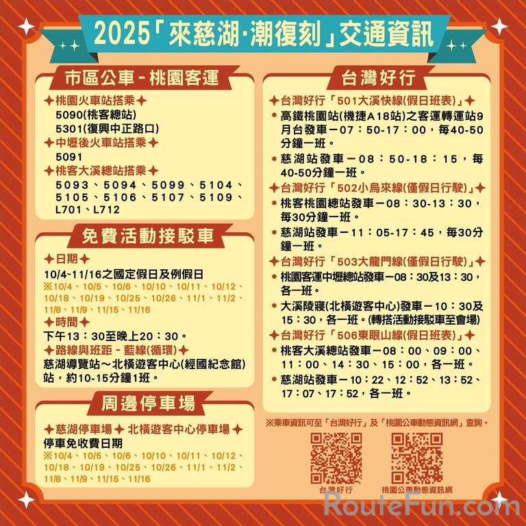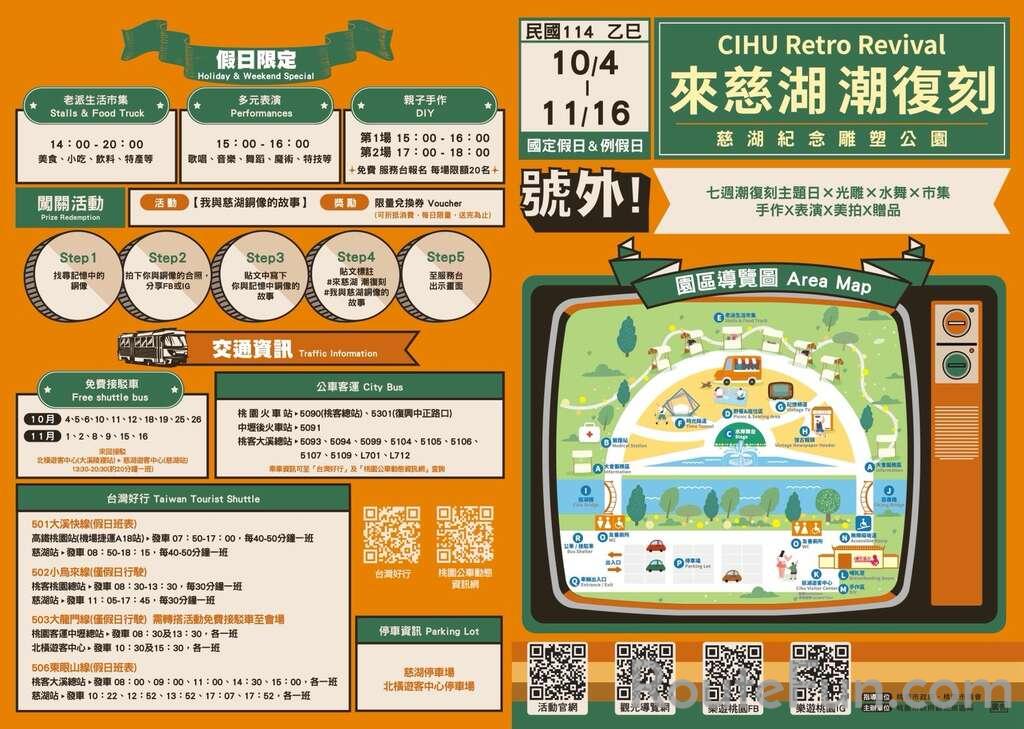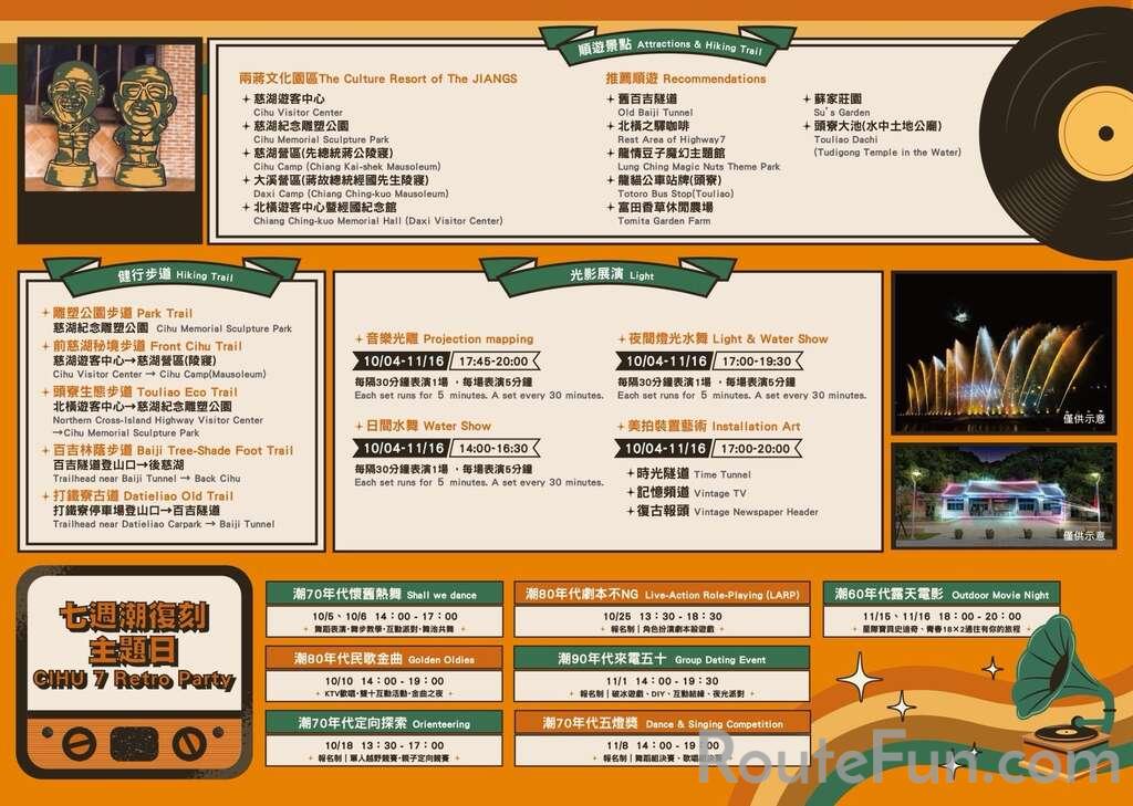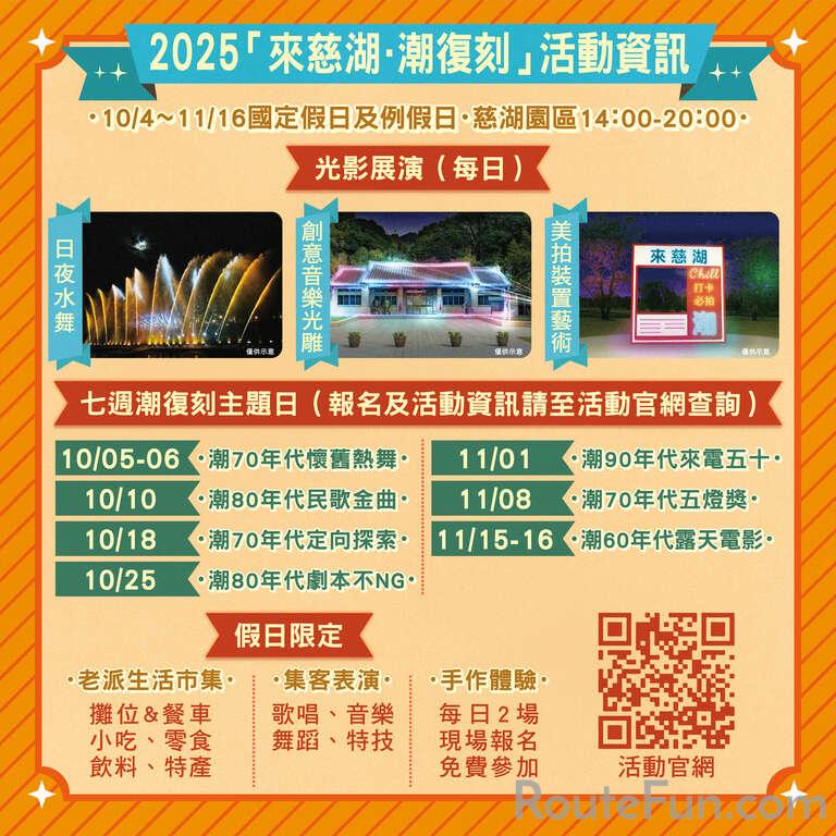 2025來慈湖. 潮復刻活動於10月4日至11月16日之國定假日及例假日14:00~20:00在慈湖園區舉行,活動包含音樂光雕、日夜水舞秀、七週潮復刻主題日、老派生活市集、三大美拍裝置藝術、手作體驗、多元集客表演及限量免費通關贈品。七週潮復刻主題日包含:10/5-10/6「潮70年代懷舊熱舞」、10/10「潮80年代民歌金曲」、10/18「潮70年代定向探索」、10/25「潮80年代劇本不NG」、11/1「潮90年代來電五十」、11/8「潮70年代五燈獎」、11/15-11/16「潮60年代露天電影」。