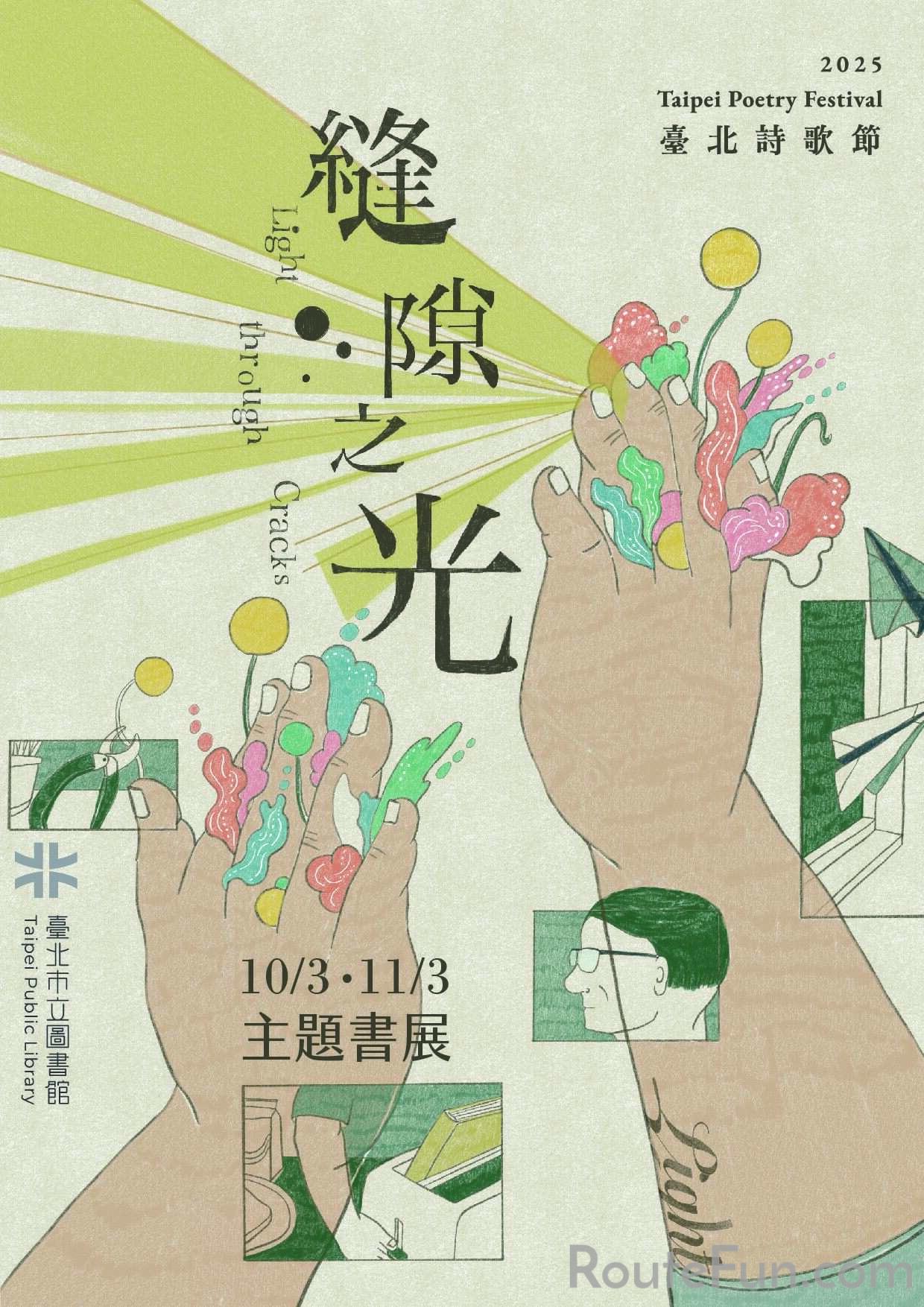 2025臺北詩歌節於10月3日至11月3日在臺北市立圖書館總館、各分館和民眾閱覽室舉行,透過系列活動,讓詩歌成為溫柔的微光,照亮你我的日常。主題書展將在臺北市立圖書館總館、各分館及民眾閱覽室舉辦,透過與會詩人的作品,從再平凡不過的日常風景,探索文學的無限可能。活動期間,只要到圖書館借閱書展書籍,即可獲贈臺北詩歌節歷年《詩選》以及兒童詩歌主題繪本各1本,贈品數量有限,送完為止。