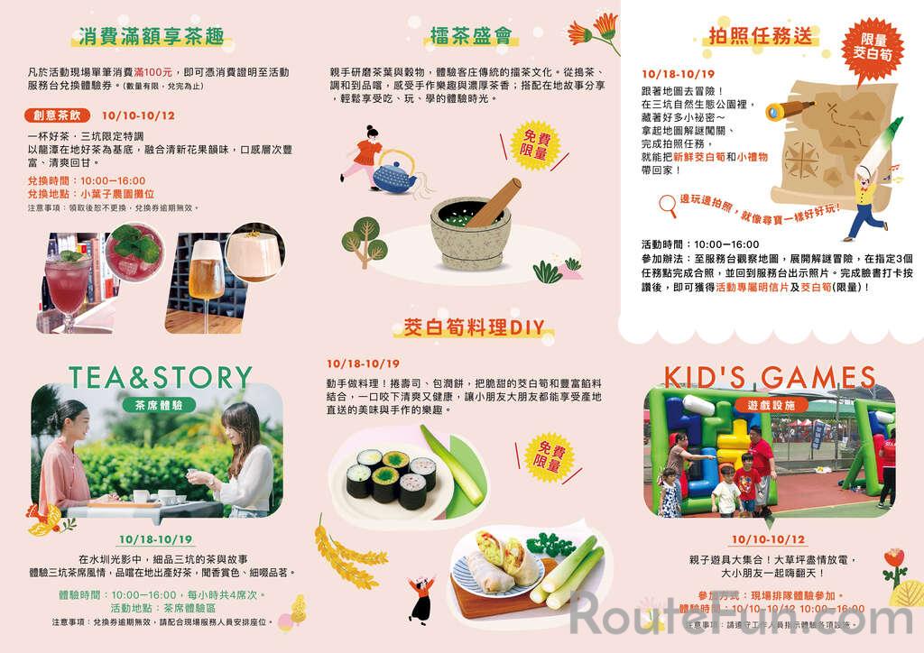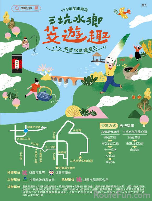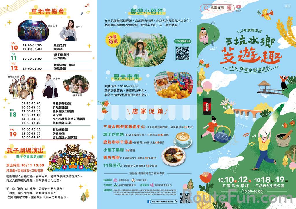 2025龍潭三坑水鄉茭白筍節將於10月10日至10月19日舉行,包含擂茶盛會、農遊體驗、茭白筍料理DIY、消費滿額享茶趣、創意茶飲、茶席體驗、拍照任務送茭白筍等活動。10月10日至10月12日在石管局大草坪,10月18日至10月19日在三坑自然生態公園。