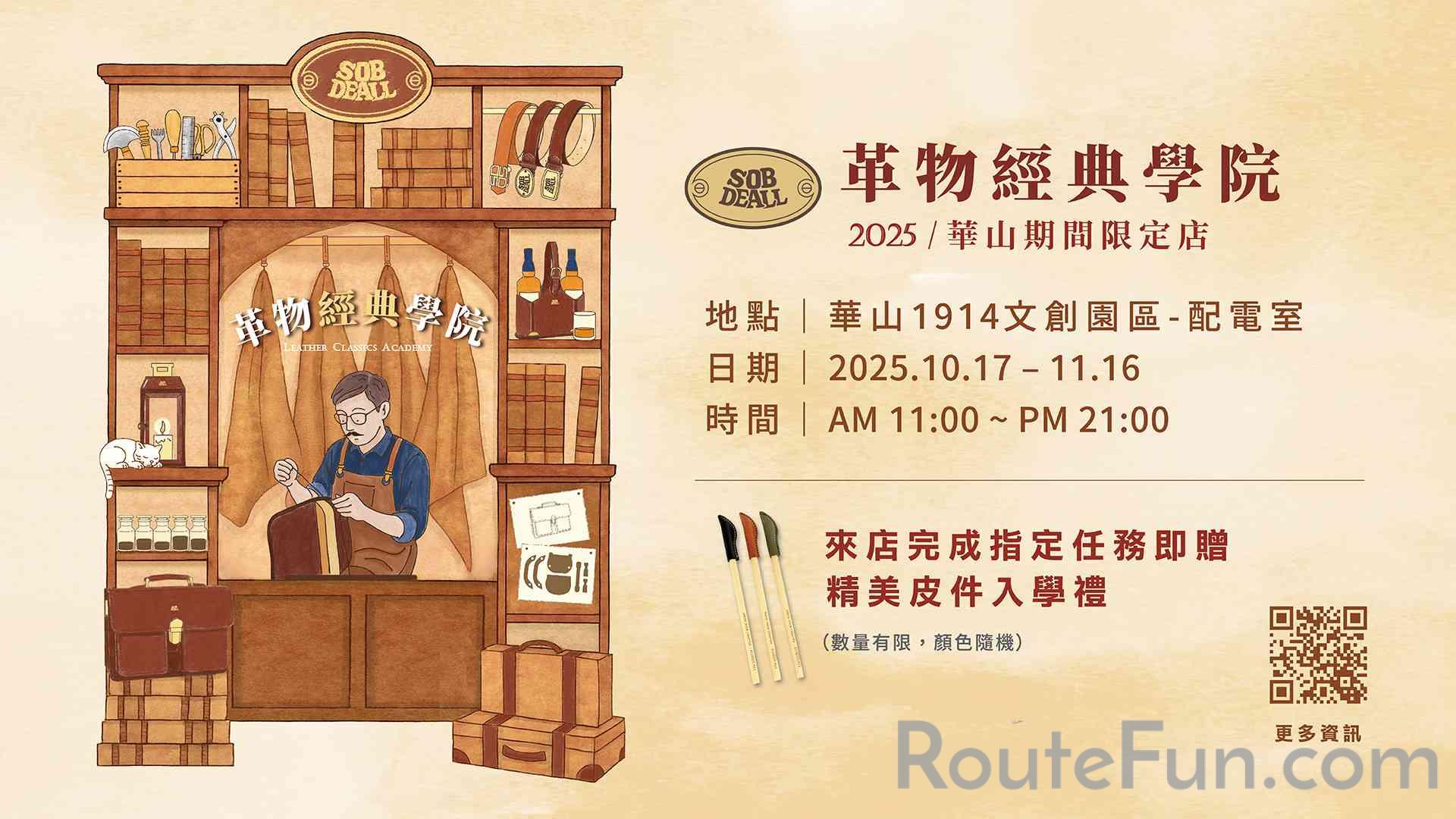 SOBDEALL 沙伯迪澳打造的「革物經典學院」華山期間限定店,是一所沒有年齡門檻的生活學院。在這裡,每位訪客將以「入學生」的身份,展開一場與工藝共學、與時間共感的旅程。走進以SOBDEALL皮革生活美學為脈絡的場域,帶您慢讀台灣皮件品牌累積多年累積的工藝精神與設計哲學,在這段探索過程中,你將看見「好物件」背後的價值,感受工藝如何在時間流轉中留下印記。革物經典學院,邀請您一同探索革物與日常,成為本學院的風格研究生! 限定店專屬活動:來店打卡即贈精美皮件好禮、11/8工藝選修課 手作課程體驗、獨家新品搶先優惠販售 經典箭矢風琴包 限定店獨享價 $6,800 (原價 $9,800)