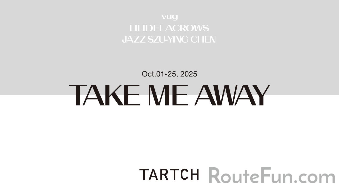 「旅行」是一種身體的移動,更是一種心靈的漂流。當我們說「Take me away」時,呼喊的不只是地理上的遠方,而是想逃離當下、尋找另一種存在方式。藝術,便是最誠實的護照:它帶我們穿越記憶、符號、城市與日常,進入藝術家親自開拓的精神疆域。本展集結三位來自日本與台灣的藝術家 —— vug、 Lilidelacrows 李中立、Jazz 陳絲穎。他們各自的生命歷程與藝術語言,都帶著「離開—抵達—再出發」的軌跡;他們的作品是日記、是詩句、是紀念章,也是觀眾心底那句「Take me away」的回應。