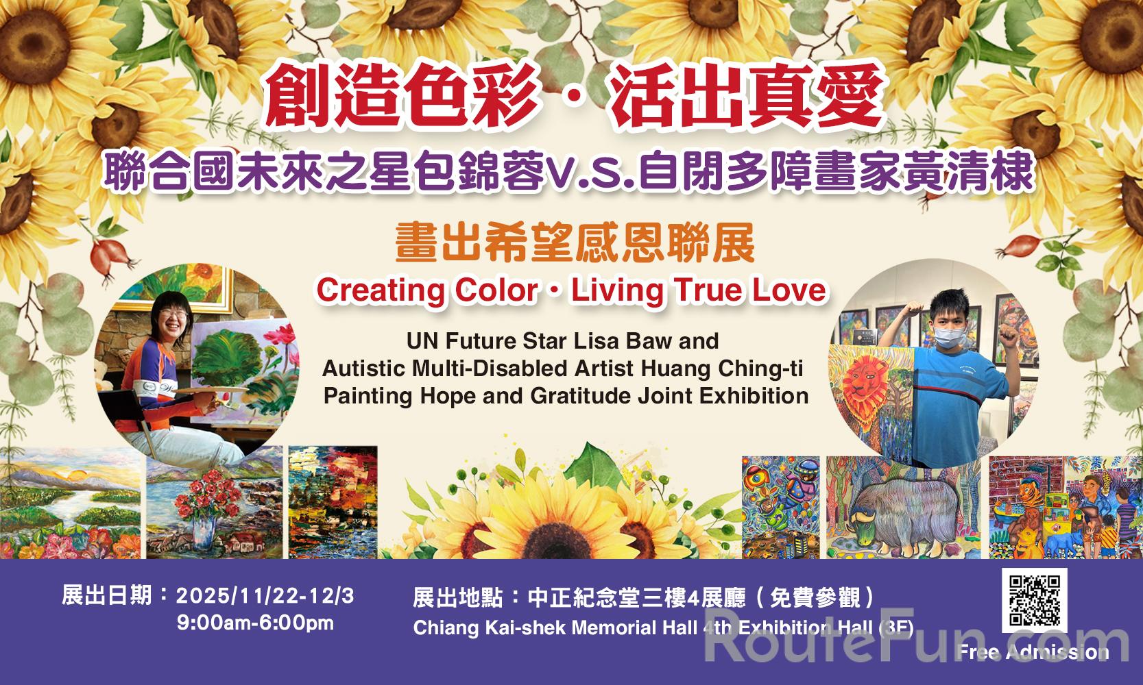 包錦蓉與黃清棣聯合畫展,展現他們在面對人生挑戰時的堅持與勇氣。包錦蓉的畫作色彩鮮明、線條俐落,展現出她樂觀、堅韌的個性。黃清棣的畫作常以動物為主題,色彩明亮且富有情感,帶有溫馨、趣味的氛圍,呈現出他對生命和自然的深刻理解。