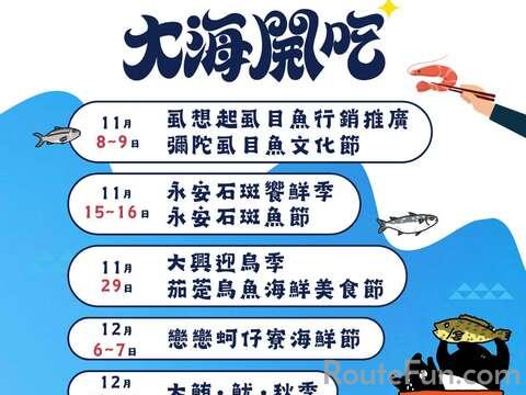 11/8–9【虱想起虱目魚行銷推廣・彌陀港虱目魚文化節】觀光客船巡禮、虱目魚之夜、親子體驗活動,以港灣風光揭開活動序幕!11/15–16【永安石斑饗鮮季・永安石斑魚節】石斑魚饗宴、石斑魚特賣會、美食市集、景點列車體驗、寫生活動與親子氣墊城堡,讓大小朋友走進漁村,大啖新鮮海味。11/29【大興迎烏祭・茄萣烏魚海鮮美食節】烏魚特賣、海洋美食推廣市集、幸福魚旗彩繪與氣墊城堡等活動,結合親子娛樂與美食饗宴,打造熱鬧又溫馨的漁港慶典!12/6–7【戀戀蚵子寮海鮮節】連續17年舉辦的「糶(ㄊㄧㄠˋ)手搶拍活動」登場,再現傳統魚市場的熱鬧景象與漁村精神,體驗最道地的海味文化 12/13–14【大鮪・魷・秋季】壓軸登場!秋刀魚特賣、試吃活動,以及眾所期待的「海鮮五寶美食晚宴」,為整個大海開吃活動畫下最鮮美的句點。【大海開吃 ft. 馬來貘 LAIMO】聯名裝置藝術今年活動特別與台灣知名插畫角色馬來貘LAIMO攜手合作,以高雄特色漁產為靈感,打造多款充滿創意的公共藝術作品。展期:11/-12/7地點:彌陀漁港海光廊、永安休閒公園、梓官蚵子寮漁港