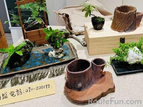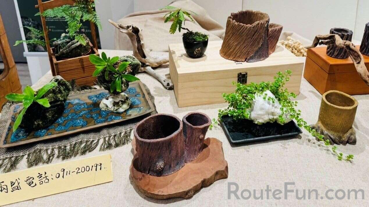 臺北市休閒農業旅遊推廣中心現正展出〈一方陶境・霜月植語〉陳雨盛掌心裡的小陶盆栽展。小陶盆栽作品以多種自然素材與植物組合而成,每一盆都依照植物的光照、水分等生長條件細心挑選搭配,讓同盆中的植株能穩定共生,呈現自然協調的樣貌。創作者陳雨盛也會根據植物的狀態進行調整,定期替換部分較需要日照的作品,讓展覽內容隨著植物生長而慢慢變化,是一個「會持續更新」的展覽。