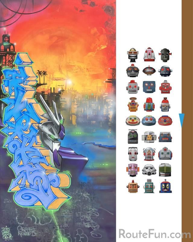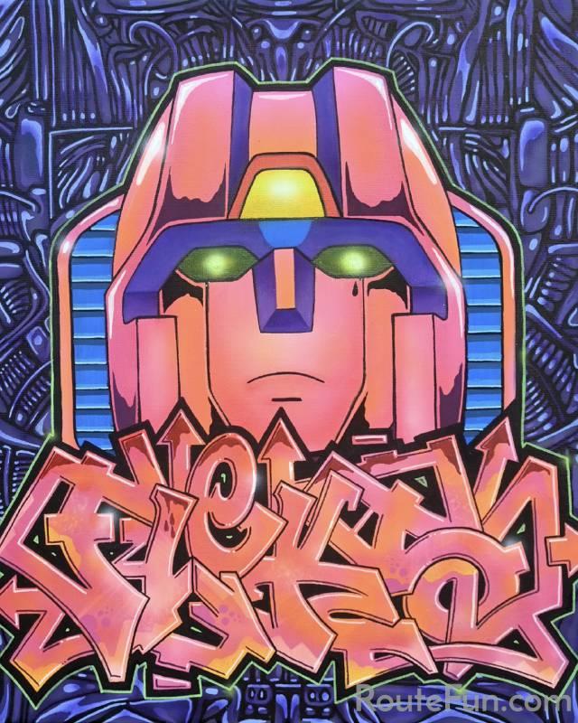 他融合未來科幻與太空意象,在塗鴉文化的脈絡中,構築出記憶、想像與當代能量的視覺宇宙,探索穿越時間維度的塗鴉樣貌與其當代表述。
