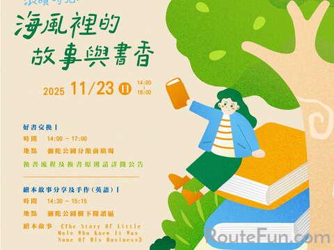 活動內容:好書交換、英語故事 + 手作、台語故事 + 手作、海線潮旅行:闖關活動、節目表演、竹編/斗笠彩繪/手作魚丸、親子互動表演、抽獎活動