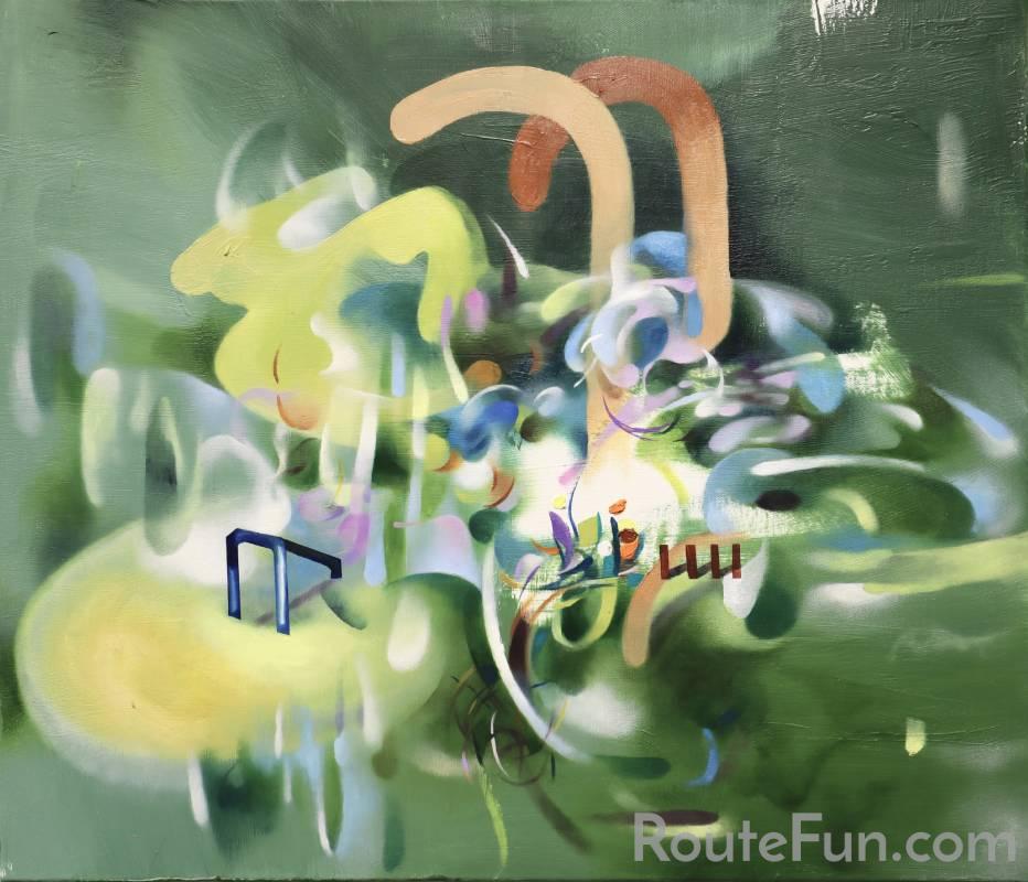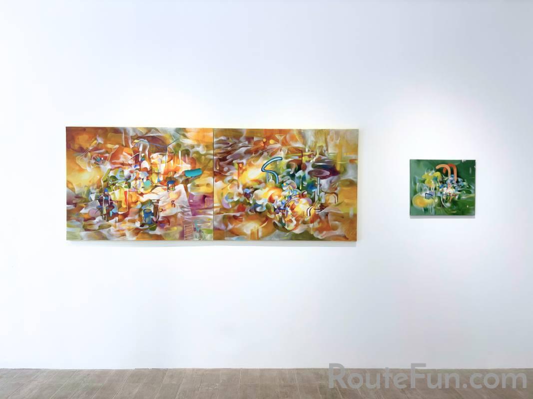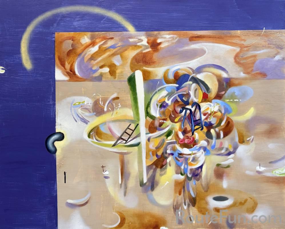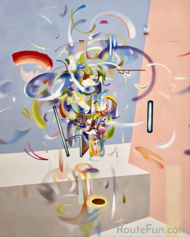 在畫面中,顏色與筆觸的碰撞生成不斷聚合與分裂的形態,帶有有機體般的律動感。景觀處於尚未定型的狀態,既包含靜止的凝縮,也隱含喧鬧的擴散,宛如城市活動與日常痕跡的殘像被捕捉其間。作品中的物件來自室內、建築與城市空間的拆解與重構,筆觸與空間在其中交融,使畫面游移於秩序與混沌之間。