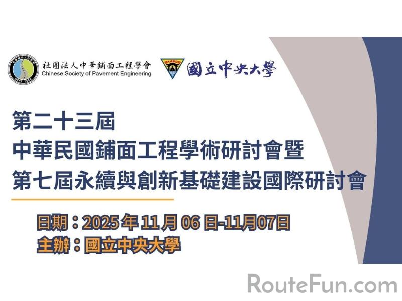 中華鋪面工程學會授權國立中央大學舉辦「第二十三屆中華民國鋪面工程學術研討會暨第七屆永續與創新基礎建設國際研討會」,將於2025年11月6日至7日在桃園會展中心舉行。邀請各界學者專家先進惠賜鴻文,並踴躍出席參與。更多資訊請參閱官網: http://https://sites.google.com/view/pave2025