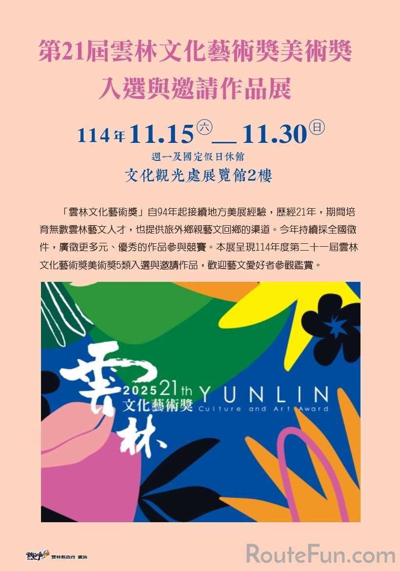 「雲林文化藝術獎」自94年起接續地方美展經驗,歷經21年,期間培育無數雲林藝文人才,也提供旅外鄉親藝文回鄉的渠道。今年持續採全國徵件,廣徵更多元、優秀的作品參與競賽。本展呈現114年度第二十一屆雲林文化藝術奬美術奬5類入選與邀請作品,歡迎藝文愛好者參觀鑑賞。展覽時間09:00~17:00