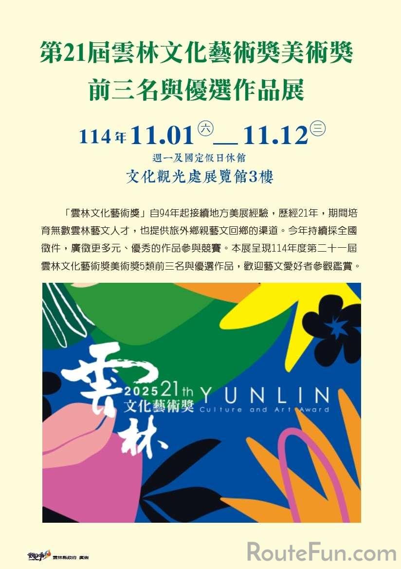 「雲林文化藝術獎」自94年起接續地方美展經驗,歷經21年,期間培育無數雲林藝文人才,也提供旅外鄉親藝文回鄉的渠道。今年持續採全國徵件,廣徵更多元、優秀的作品參與競賽。本展呈現114年度第二十一屆雲林文化藝術奬美術奬5類前三名與優選作品,歡迎藝文愛好者參觀鑑賞。
