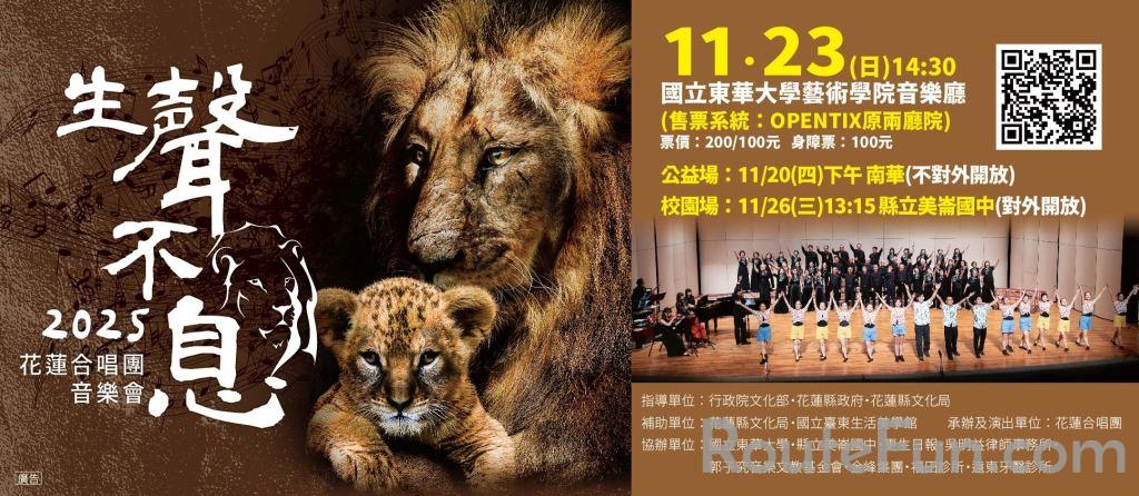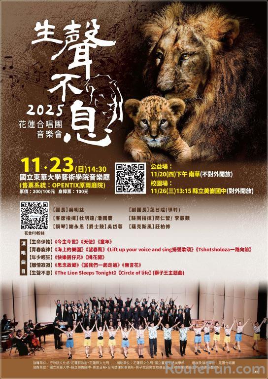 花蓮合唱團今年的成果發表會,演唱型態有男女混聲四部、男聲二部、女聲三部,語言表達有國語、英語、南非語、閩南語、客家語、原住民語,總共選唱16首中外好聽歌曲。