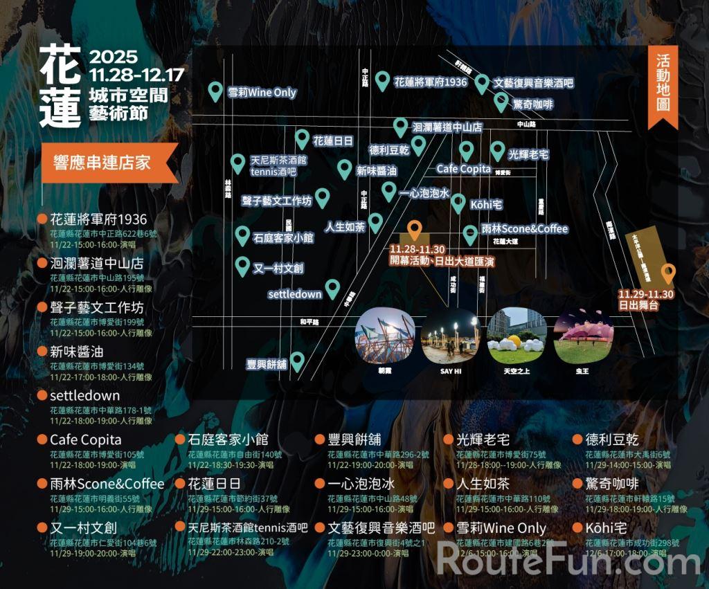 從【日出大道】的藝術裝置及匯演、【日出舞台】的晨光演出、到【響應串聯】藝術走進店家、【周邊配合】至各鄉鎮開設講座及演出