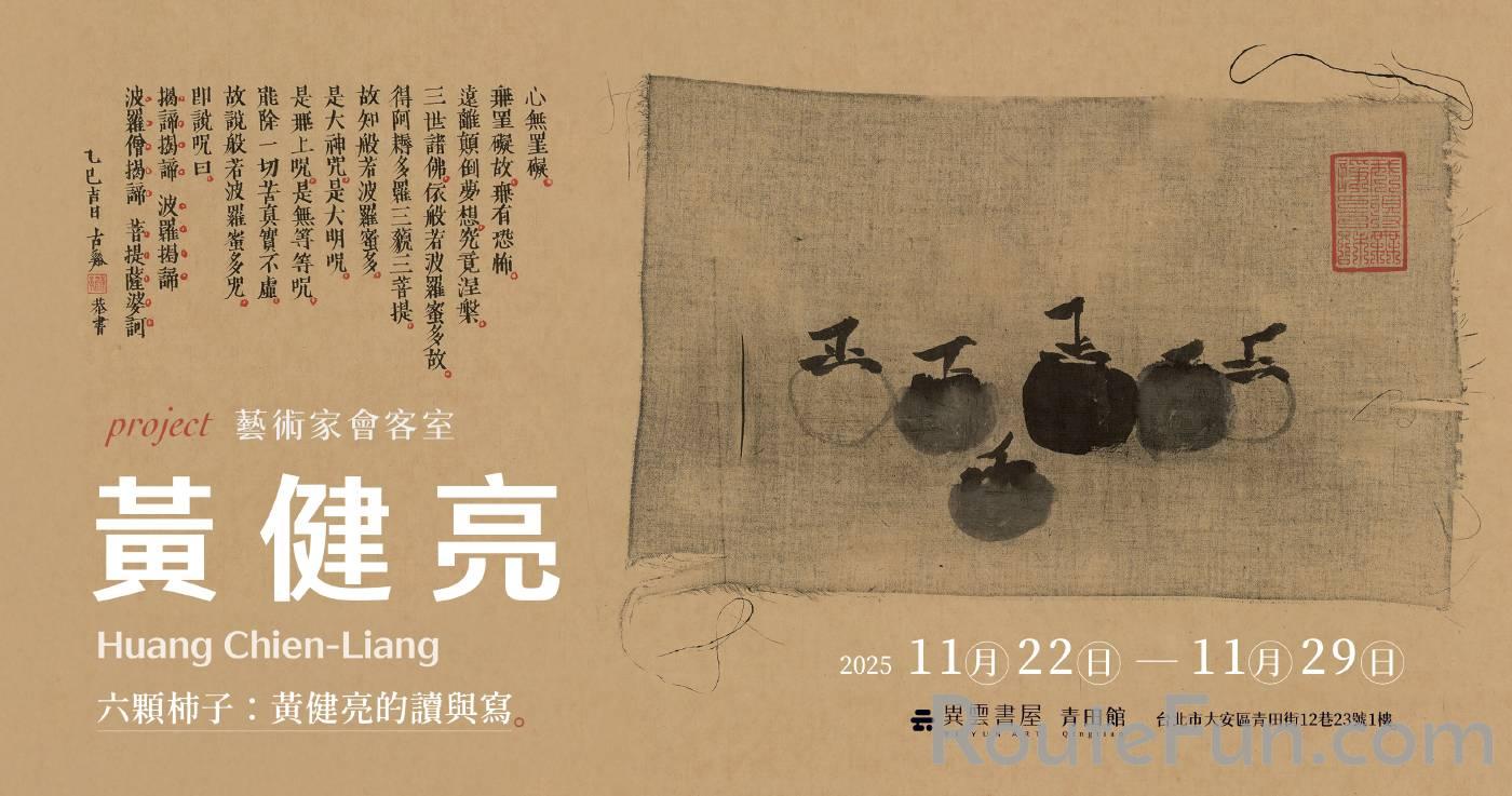 展覽消息藝術家會客室 黃健亮 The Artist’s Parlor Huang Chien-Liang 創作自述黃健亮 南宋畫僧 牧溪 的《六柿圖》被認為是「禪畫」的代表作。禪宗不立文字,「六柿」或寓「六識」,即六種感官和心理活動的認知功能——眼識、耳識、鼻識、舌識、身識、意識,如此構成我們生命經驗的基本機制。 人過六十,其中五識——眼、耳、鼻、舌、身——漸歸渾沌,唯獨「意識」日趨清明。乃借用 牧溪《六柿圖》紀錄人生的幾個階段。自幼不擅讀書,但頗能享受漫讀雜句,且讀且畫的樂趣。前人的吉光片羽像是一顆多稜切割的鑽石,往往不經意間就照見自己的形影;而字裡行間有條細縫—— 那是藝術靈光照進來的地方。 展覽簡介 在本次的「藝術家會客室」企劃中,異雲書屋很榮幸能為您呈現藝術家 黃健亮 的作品。由南宋畫僧 牧溪 的《六柿圖》為楔子,串起藝術家自青春年少至年過六十的生命軌跡——從早年青澀敏銳、壯年清醒自省,再到中年後的澄明與放下——借用柿子的變化,隱喻生命在不同階段的熟成。 無論是徐志摩的〈偶然〉、鄭愁予的〈錯誤〉,或者村上春樹〈挪威的森林〉、黃庭堅的〈花氣熏人帖〉,乃至董其昌〈骨董十三說〉、《六祖壇經》,黃健亮在讀與寫之中,構築自我的精神實踐,通達了內在、感知、記憶與時間,領略生命「欣於所遇,暫得於己,如此而已」之況味。當青澀褪盡,萬事回甘,他以枯殘蓮梗撐起一幡清風,藝術成為理解世界與自我的另一種清明。 關於藝術家 黃健亮 別署古谿,1963年生於嘉義。臺灣藝術大學藝術碩士。長期從事「茶與文人」研究與美學創作,相關出版著作甚豐,現為台北故宮藏品徵集評委。基於對傳統文人生活的深刻體會,作品以現代水墨形式,從文人視野出發,藉由古代雕版字書寫出傳統文學、生活美學的經典哲思,佐以古雅內斂的視覺圖像。在瞬息萬變的時代,汲古創新,展現慢生活中的吉光片羽,也折射出科技浪潮披沙瀝金之後的傳統餘暉,深遠內斂,令人發思古之幽情,咀嚼再三。 藝術家會客室 黃健亮 The Artist’s Parlor Huang Chien-Liang 座談日2025 11 22 SAT 15:00 限時開放2025 11 22 - 11 29 時間12:00-18:00,日、一公休