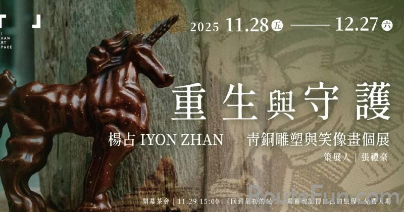以自身為例,楊占表示在一次冥想中展開了意識之旅,成功地召喚了他的守護天使──一頭名為傑克的巨大火龍,在經過一番對話確認後,傑克瞬間縮小到盈掌大小的尺寸,坐在他的右肩上跟著一起回家,此後就會不時出現在他身旁,提供許多寶貴建議。此外,他也先後遇過兩個指導靈,指引他更深入地去瞭解醫療與科技,透過練氣來調整自己的身體狀況等等。同時,也是在這樣的意識狀態下,楊占在冥想過程中往往會經歷一種無以言喻的狂喜,並且對展現在眼前那美麗又神秘的世界充滿好奇與敬畏。這些探訪靈性源頭、召喚守護存有的獨特體驗都化為其藝術創作的強烈動能。而是次「重生與守護──楊占青銅雕塑與笑像畫」展覽,共彙集了不同媒材與創作時期將近百件的作品,可視為藝術家秉持其創作初衷的一次完整呈現。