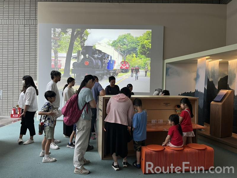 「阿里山林鐵行動學校」以行動展覽方式,攜手國立自然科學博物館與國立臺灣博物館,突破地域限制、跨館際合作。本次特展以「時光隧道中的移動風景」為主題,邀請觀眾一同走進阿里山林鐵的時空軌跡,從歷史、人文到自然景觀,探索一條橫跨地理與記憶的鐵道旅程。「林鐵探索展坊」從觀光視角切入,介紹林鐵的沿線站點、登山軌跡及鐵道知識;「翻山越嶺」則以人文藝術視角,在大隧道裝置中,觀看林鐵車輛的演變,在小隧道中感受阿里山豐富的自然生態,並透過畫作與詩歌帶領民眾認識文化底蘊豐富的阿里山。現場更設有「共創互動區」,每日限量提供專屬設計的隧道印章明信片,觀眾可自由蓋章收藏,讓參觀體驗更具互動性與趣味性。