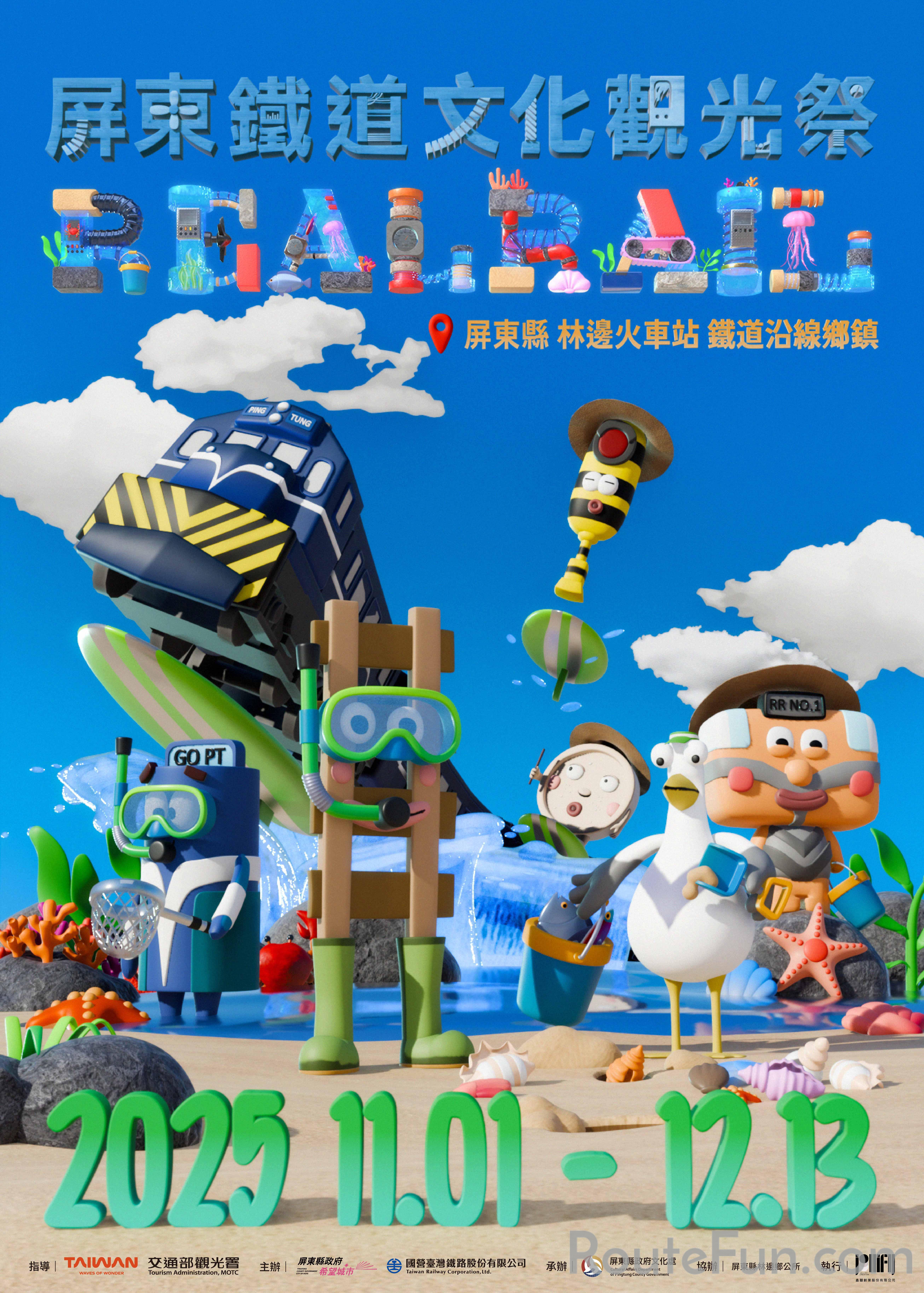 2025屏東鐵道文化觀光祭將於11月1日、2日自林邊鄉歡樂啟動,今年主打「親子同樂」,開幕活動邀請深受小朋友喜愛的紙風車劇團帶來《巫頂看世界》精采演出,更有活動專屬創作的鐵道主題兒童音樂劇《藍寶Let’s Go》,讓音樂、劇場與鐵道故事在舞台上魔幻交織。現場還有彩繪列車、創意親子鐵道便當、主題市集與派對表演,多元體驗一次滿足。活動期間串聯藍皮解憂號列車、鐵道走讀、鐵道講座與藝術宅急便等豐富系列活動,更結合鐵道藝術裝置推出鐵道IP公仔抽獎任務。