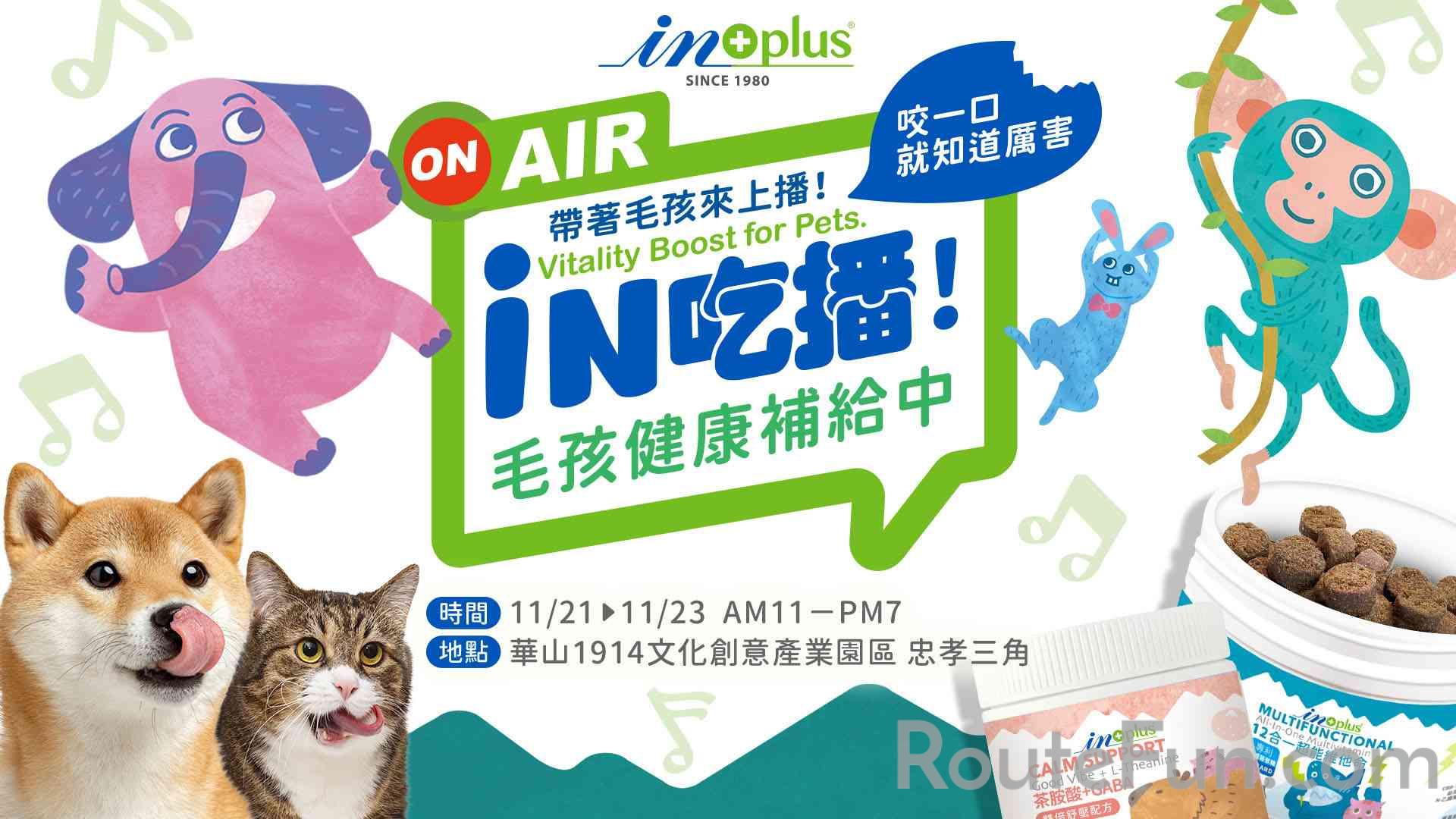 IN-Plus零食系寵物保健品首場快閃店將在華山1914文化創意產業園區忠孝三角登場。活動三天:現場加入INPlus官方LINE OA就能獲得保健品體驗組,每天開放時段,讓到場的毛孩做線上吃播,當最萌吃播主,拍照打卡上傳,還能抽產品正貨一組。趕快帶著毛孩來華山1914文創園區-忠孝三角一起開播吧!