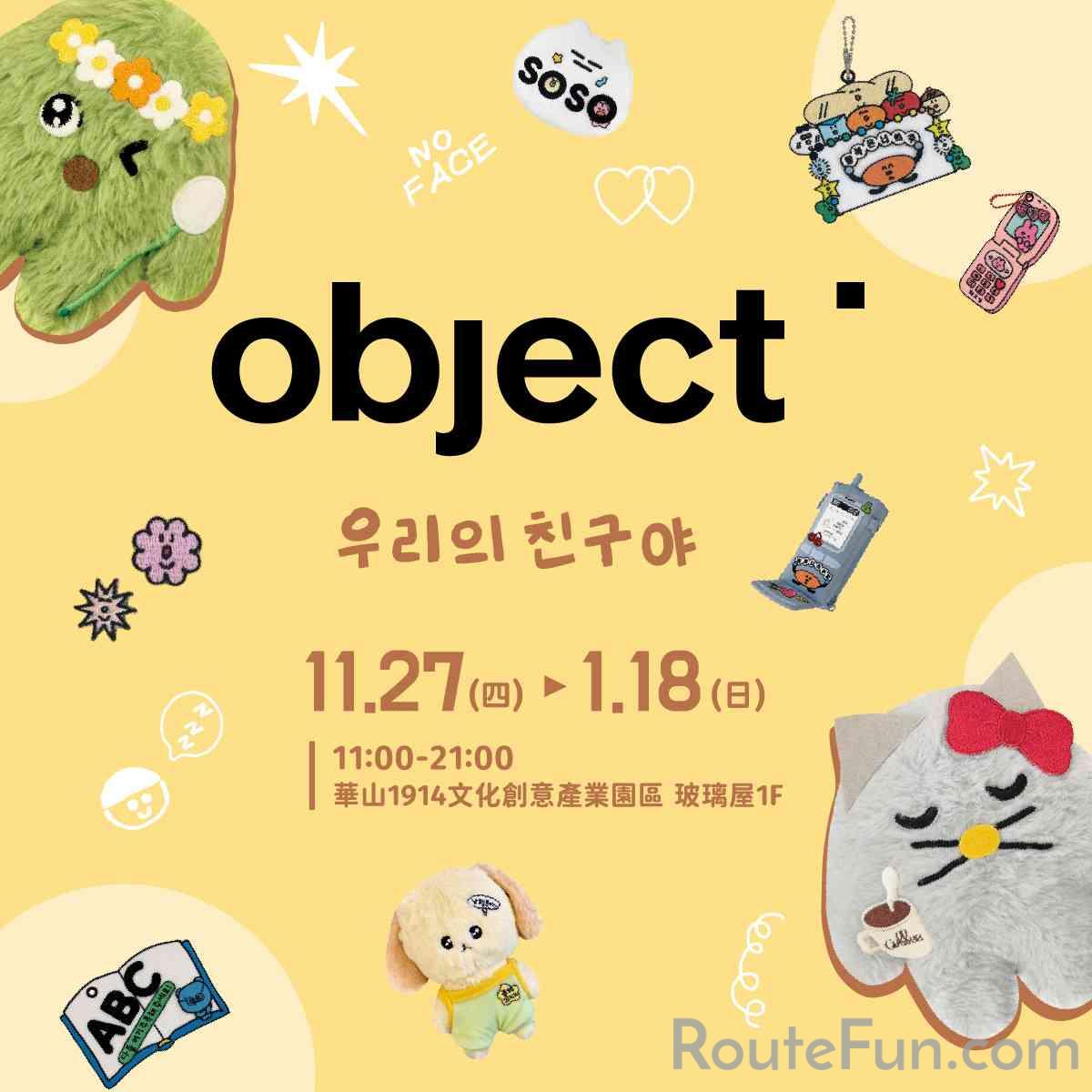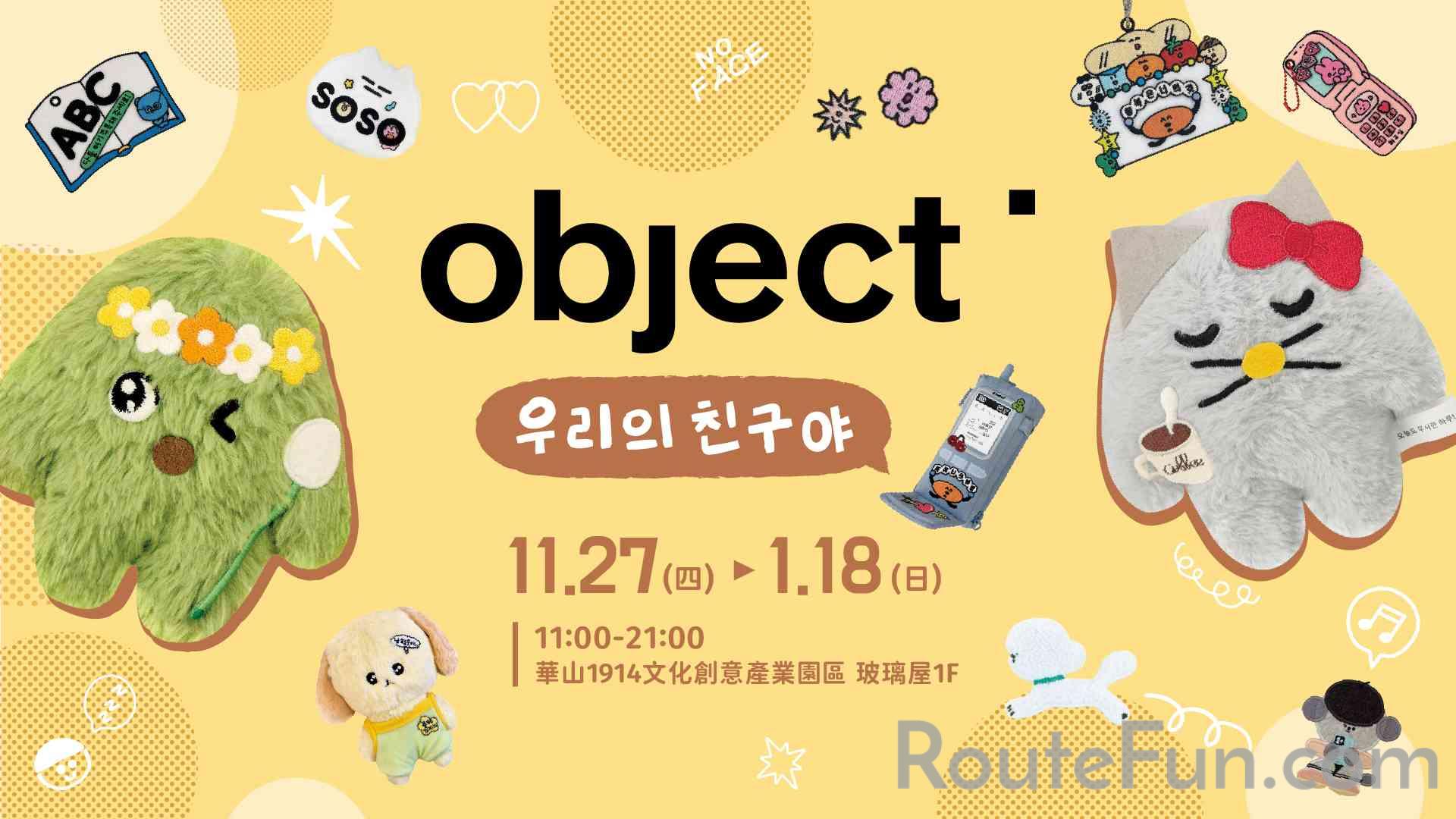 來自首爾的選物品牌 object 年末登場華山!以「我的朋友呀」為主題,開啟專屬於台北的快閃限定體驗。來自韓國首爾的選物品牌 object(오브젝트),自 2013 年創立以來,一直致力於讓創作者的 靈感與故事被更多人看見。透過選品、展覽製作與內容共創,串聯設計師、插畫家與消費者 ,讓創作成為生活的一部分。繼 2025 年 5 月 object 首度於台北開設常設店 object taipei store 與 object showroom 後 ,今年冬季將於 2025 年 11 月 27 日(四)至 2026 年 1 月 18 日(日) 期間,即將進駐 華山 1914文化創意產業園區 玻璃屋 1F,推出全新主題快閃店【我的朋友呀 – 우리의 친구야】。這次快閃以「朋友」為靈感,邀請大家在充滿節慶氣息的冬季裡,挑選屬於彼此的小禮物,傳 遞溫暖與心意。將以韓國設計美學為軸心,結合 object的特色選品與體驗內容,打造最具創 意與溫度的年末快閃空間。年末禮物季,在華山遇見我的朋友呀。本次快閃同時集結多位韓國創作者品牌: 包括以「生活 SOSO 就好」為理念、以一號表情角色聞名的 SOSO STUDIO;以簡約線條與 直白標語風格受到歡迎的 INAPSQUARE;不刻意可愛卻充滿療癒能量的 CHOEGOSIM (崔高興);以及曾與 Gucci 合作、榮獲波隆那插畫獎、以詩意筆觸描繪狗狗靈魂的 TEXTCONTEXT。此外,drawingmary、HUGINN AND MUNINN、Naive Garden、HAND IN GLOVE、 HOZUMI等人氣韓國插畫品牌也將同步登場,呈現多元風格的創作選品。 這次快閃特別推出多款華山限定設計,包含象徵地標意象的華山建築書籤吊飾,以及融入 台灣生活日常的wappen 系列(珍珠奶茶、藍白拖、茄芷袋、小籠包)。除了限定設計外,現 場也將同步販售 object 台北店的人氣選品pyobyobyo 飲料提袋(黑/白款) 與 台北限定 奶茶色 noface 娃娃吊飾 等,以更多樣的選物組合並自行DIY,讓挑禮物成為冬日最溫暖 的儀式! 活動期間,只要現場消費即可獲得限量 object 氣球乙顆,數量有限,送完為止。門市資訊:華山1914文化創意產業園區 玻璃屋 1F ,快閃期間:2025 年 11 月 27 日(四)- 2026 年 1 月 18 日(日),營業時間:11:00 - 21:00