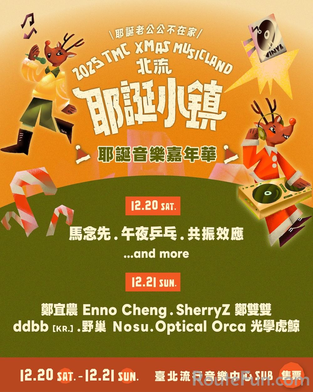 2025北流耶誕小鎮以全新主題「耶誕老公公不在家」回歸,於12月13日起正式展開一連串冬季活動,包含12月13、14日暖身派對「行動代號:麋鹿大集合」、12月20、21日系列主活動「耶誕音樂嘉年華」,以及12月19至21日、24至28日的「小鎮市集」,系列活動即將在臺北流行音樂中心文化館、 SUB 舞台以及全園區店鋪盛大登場。「耶誕音樂嘉年華」 將於 SUB 舞台集結10組人氣音樂人輪番登場,包括馬念先、鄭宜農、SherryZ 鄭雙雙等眾多實力音樂人,陪伴觀眾一起迎接耶誕。全園區店家演出活動集結逾40組音樂人,更有年度大型集章遊戲闖關活動尋找間諜薑餅人。