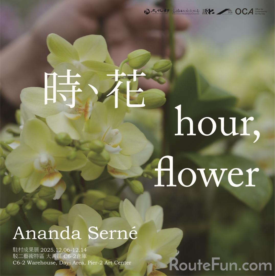 時鐘的滴答聲,與蘭花幼苗在培植介質中穩固根系的細微動作:《hour, flower》源自藝術家造訪屏東蘭園的體驗,沿著被人為光線控制的環境,追蹤花卉在全球流通的軌跡,以及人類與植物在日夜節律中交織出的關係。展覽中包含一支16毫米膠片短片,捕捉位於阿姆斯特丹附近、全球最大的花卉拍賣市場的節奏;來自世界各地的植物匯聚於此,再迅速運往歐洲各地。Serné 被這種近乎催眠的節奏吸引,選擇以類比膠片創作,以凸顯快速流通的商品與膠片材質本身緩慢、受限的特性之間的張力。