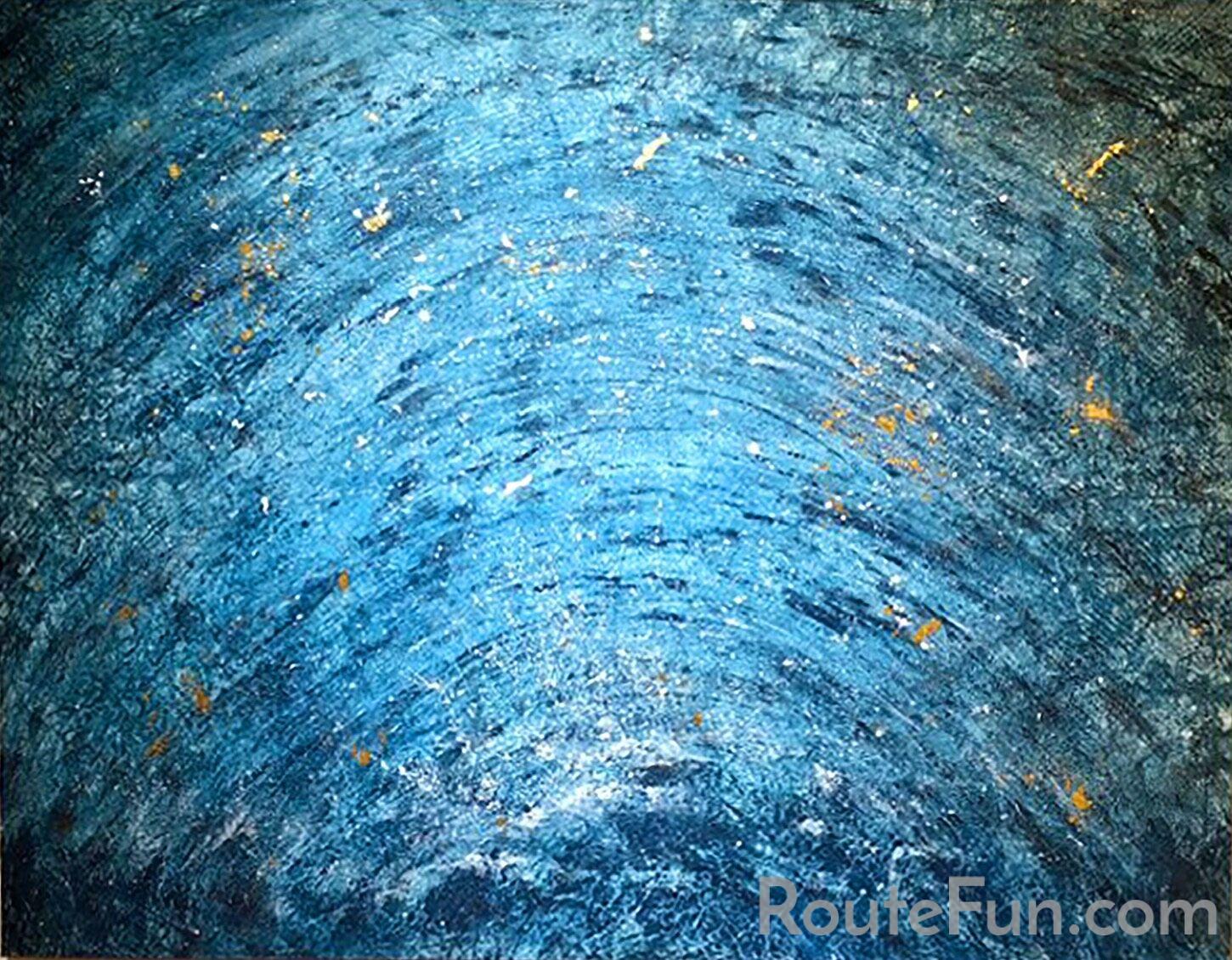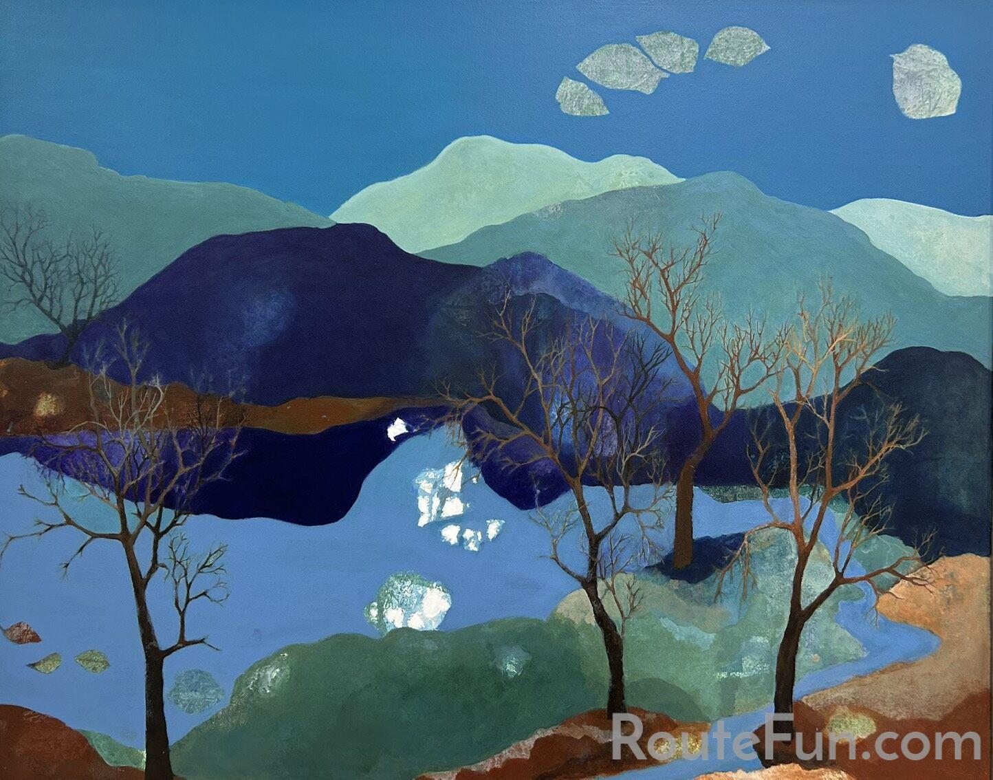 李孟蓁:童年的生活片段,總在歲月的流轉中,悄然留存在每個生命的旅程裡。記憶中的大自然,如光影般在創作的美感中浮現。對筆者而言,每一次的創作,總會喚醒童年的片段那些視覺的色彩、聽覺的旋律,甚至味覺的氣息,都深深烙印在記憶之中。這些積累的感官記憶,化作內在的能量,成為藝術創作中最深厚的養分,也是情感最真切的流露。徐江妹:作品以頌缽後的心靈意象為出發,融入東方禪學意境,轉化內在感受為藝術表現。創作於後疫情時期的混沌與壓力中,以深藍色層疊的流動感象徵動盪不安的世界,展現焦慮與不確定性。畫面中撕裂般的筆觸,映照創作者面對生活變動的無力與思索,呈現心靈於混沌中尋覓平靜的狀態。