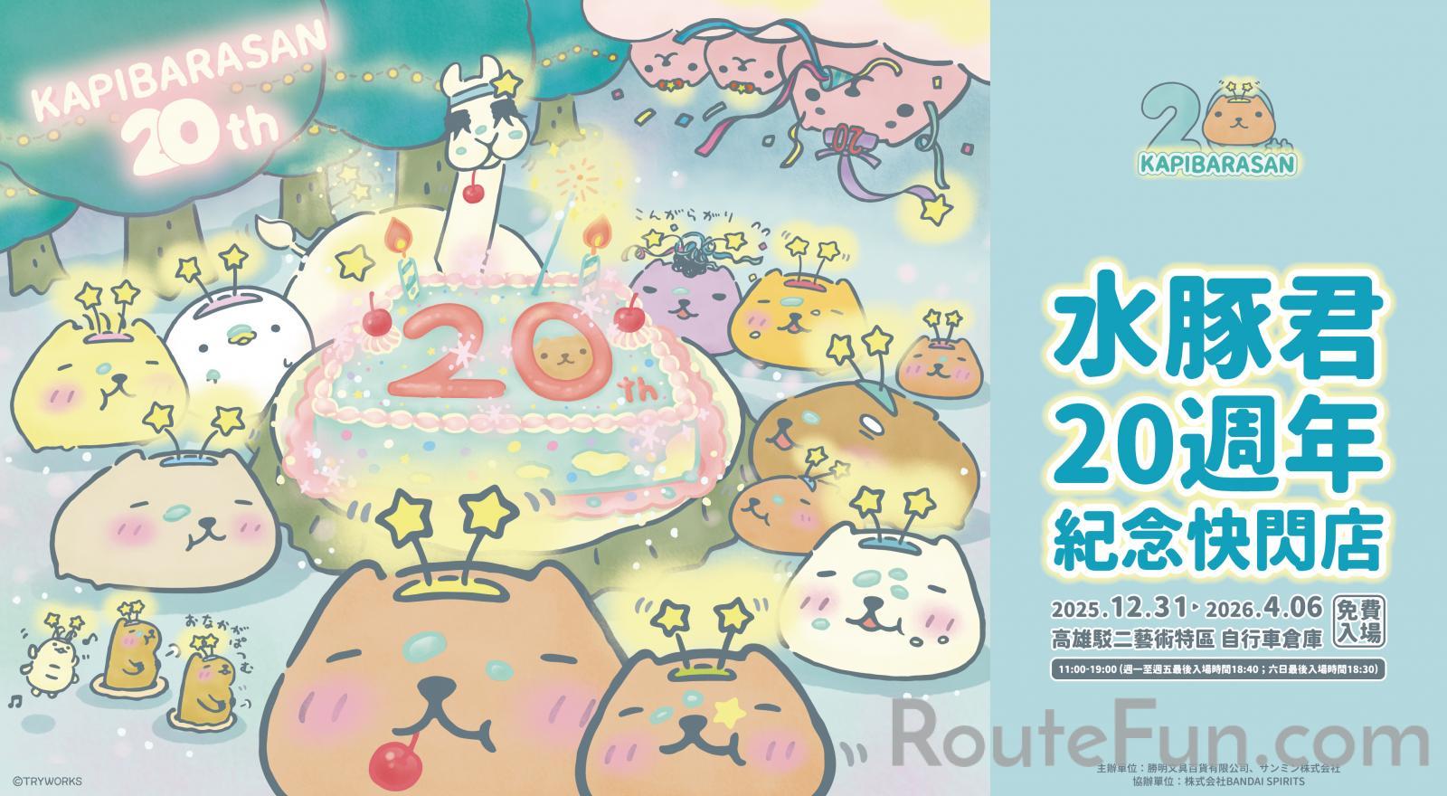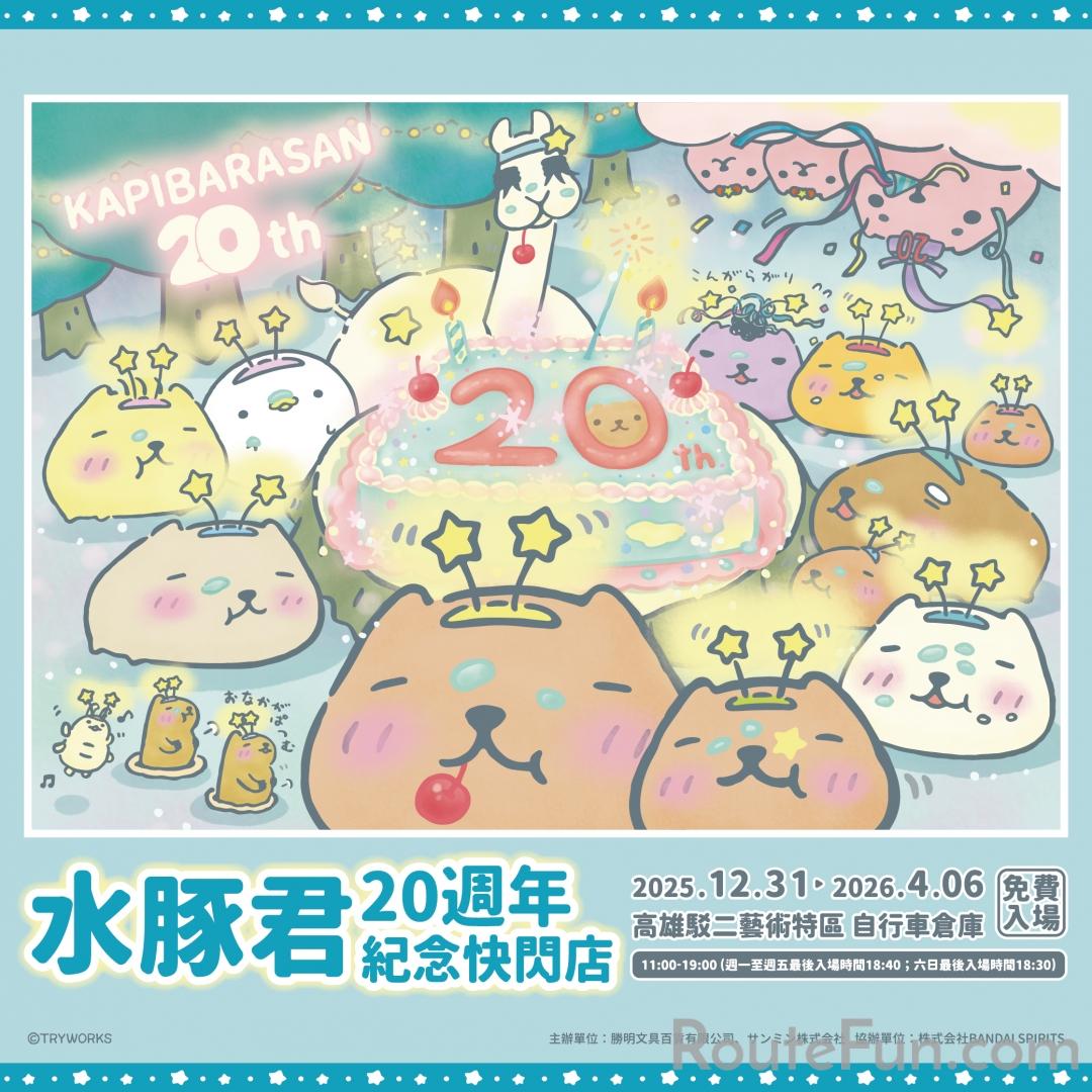 今年滿20歲的水豚君在全台舉辦了慶生派對,也要來到高雄駁二慶祝。這次派對還多了一位新朋友-閃閃君的加入,水豚君跟新朋友將在入口處迎接您!讓您可以跟他們一起打卡合照。現場會有許多20週年限定商品及新品販售,消費滿額還可以拿好禮!