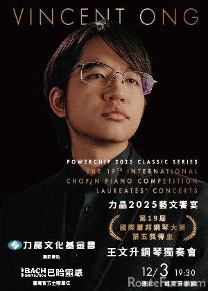 馬來西亞鋼琴家王文升,在榮獲2025年第19屆國際蕭邦鋼琴大賽中第五名,以及2024年第19屆國際羅伯特舒曼大賽第一名之後,其藝術成就贏得國際認可。演出曲目:蕭邦 CHOPIN 降A大調波蘭舞曲-幻想曲,作品61 Polonaise-Fantaisie in A-flat Major, Op. 61 24首前奏曲,作品28 24 Preludes, Op. 28 夜曲,作品62 Nocturnes, Op. 62 B小調第三號鋼琴奏鳴曲,作品58 Sonata No. 3 in B Minor, Op. 58