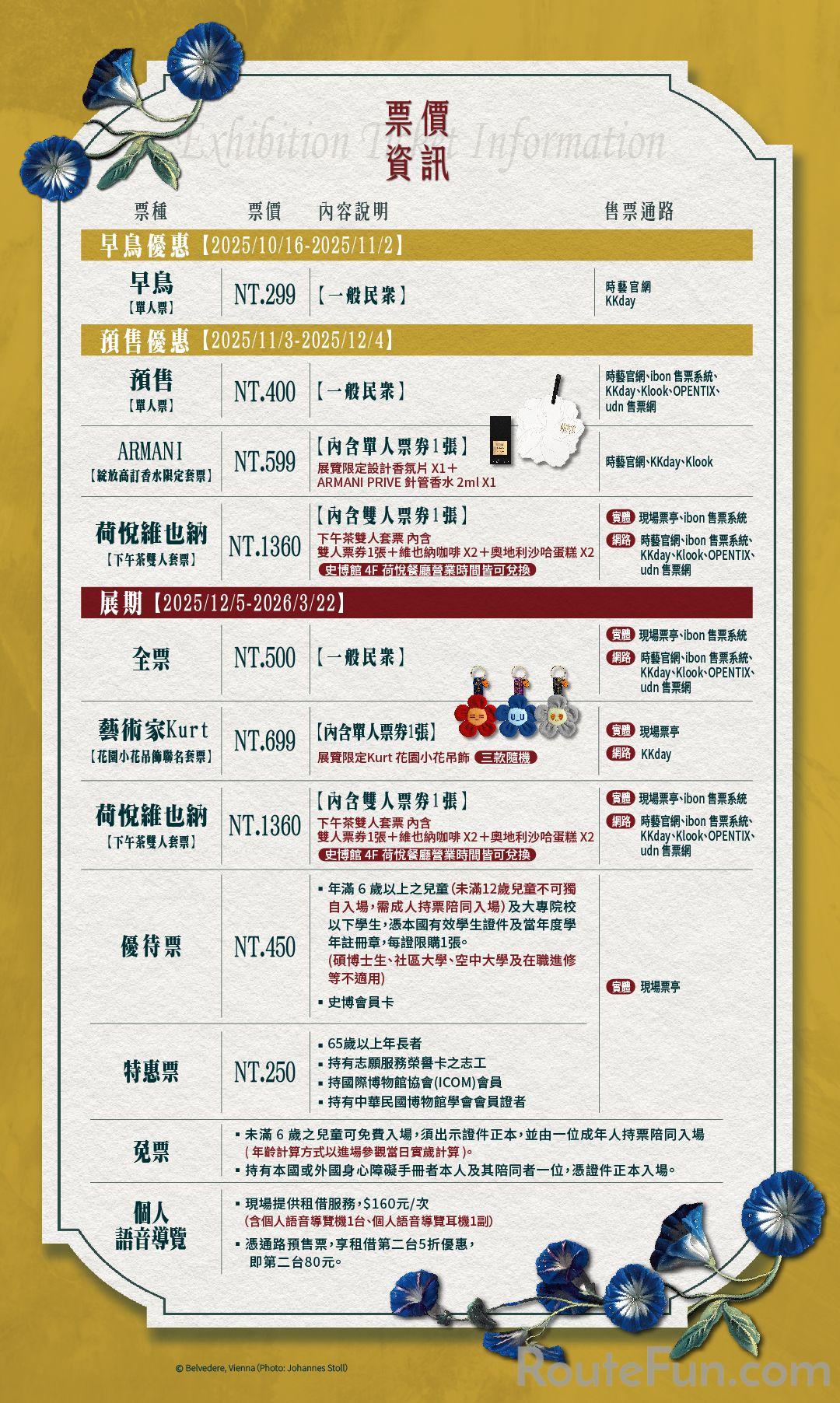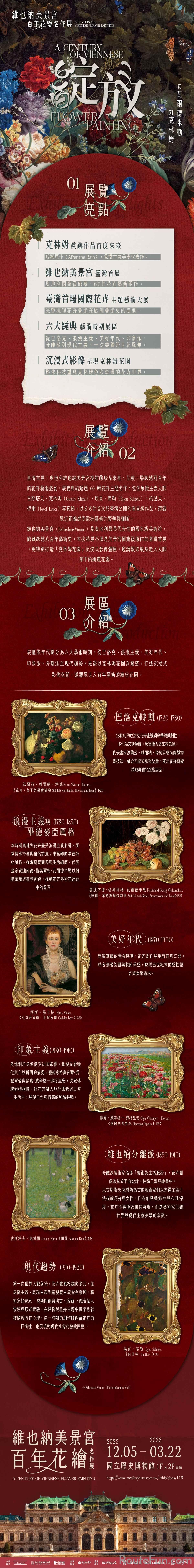 綻放 維也納美景宮百年花繪名作展— 從瓦爾德米勒到克林姆,展覽地點位於國立歷史博物館,開放時間:週一至週日10:00-18:00 (17:30停止售票及入場),除夕及大年初一休館。
