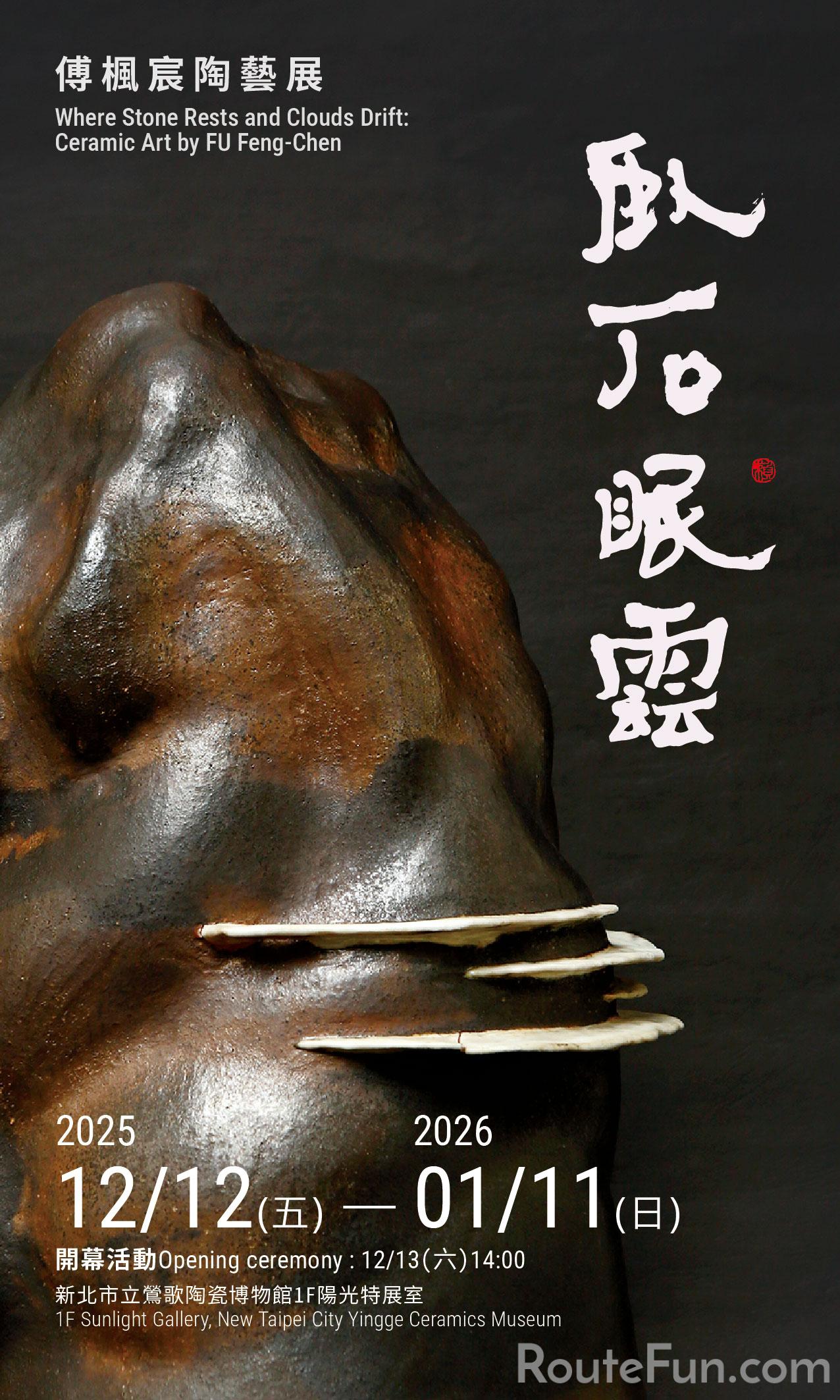在柴燒的烈焰與山水的靜默之間,傅楓宸以陶土為筆,書寫一則關於山石、雲煙與心境的篇章。作品取法山川,卻不止於形體的再現,而是將山嶺的沉穩、石的厚重、雲的流動,轉化為作品語彙。展名「臥石眠雲」寓意在自然與人心之間的棲息與呼吸—石的永恆承載雲的飄渺,正如創作者在烈火試煉後所留下的肌理與痕跡,都是一種存在的詩。傅楓宸2016年創辦「折劍居柴陶工作室」,專注柴燒陶塑創作,以山水造型為核心,並融合茶碗與器物的山石肌理,逐步形成獨特風格。作品曾獲瑞士、葡萄牙、西班牙等國際陶瓷競賽入選,逐漸受到國際矚目。此次個展將完整呈現《谿山行旅》系列山水構築之作,以及創作者最新的《方山》《圓山》系列。每一件作品,都是火與土的沉積,也是山水與文明的對話。