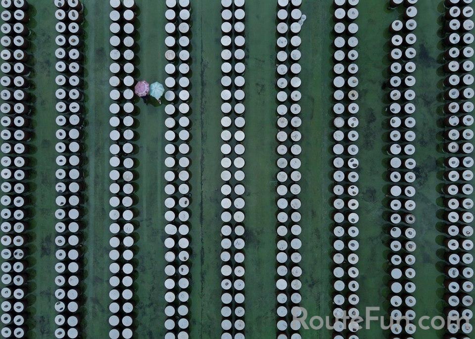 資深媒體人暨專業攝影工作者葉陶軒歷經三十餘年新聞攝影生涯後,以全新視角回望台灣,舉辦〈垂景Eyes in Flight〉空拍攝影展。作品可見曬魚場的秩序線條、退潮礁石上的孤釣者、荒廢鹽田的抽象肌理、疫情臨時檢驗棚的紅色幾何構圖,以及屏東外海箱網養殖場如星球般漂浮的壯闊景象,引領觀者突破對「風景」的慣性想像,從高空重新看見台灣深層景致。策展人暨資深視覺藝術工作者蔡文祥表示,展覽〈垂景〉之名取自東漢王延壽《魯靈光殿賦》中的「中坐垂景,頫視流星」,象徵從高處俯望世界的壯闊與靜謐。「這是一種從天際俯瞰大地的詩意視角,將現實轉化為如畫的幾何節奏與想像的韻律。」葉陶軒的空拍影像並非單純的風景紀錄,而是透過垂直視野探索土地、時間與人類活動之間的微妙關係,並以全新的視覺語言描繪台灣風土,並細膩地勾勒出人與土地之間深刻的連結。