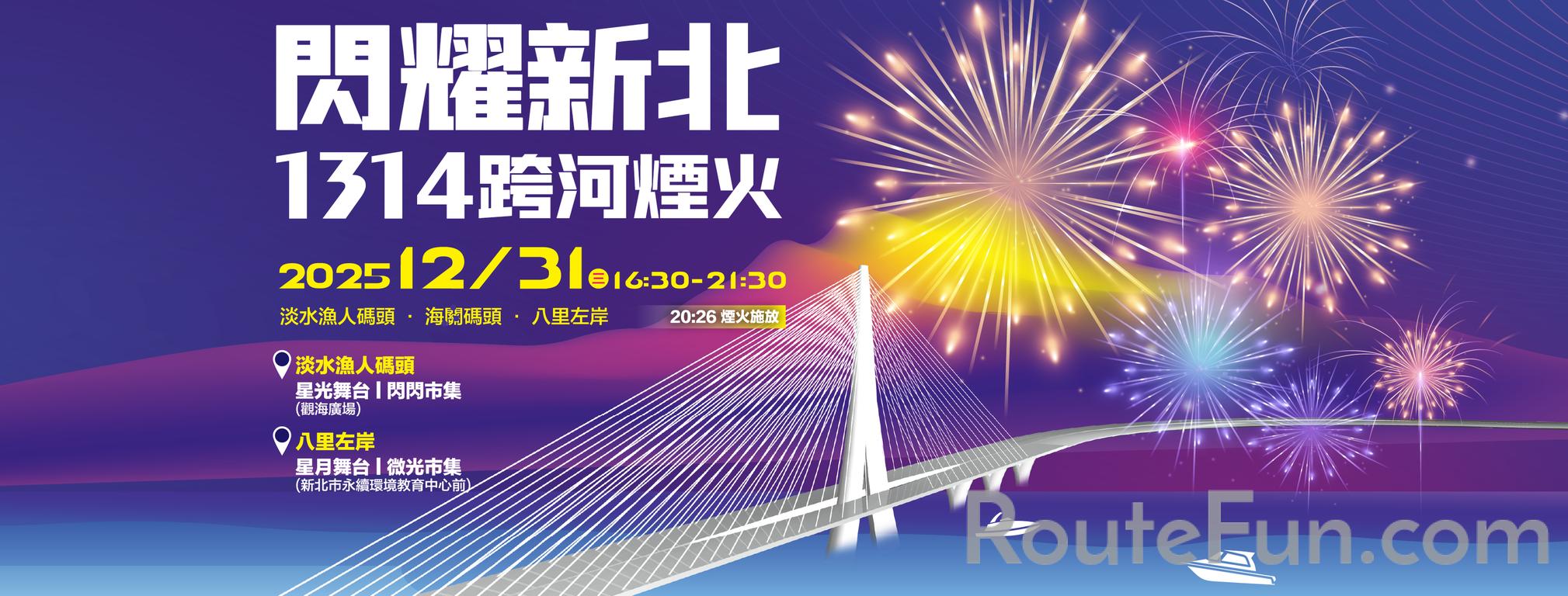 全台唯一跨河盛會,搭配全世界最大單塔不對稱斜張橋「淡江大橋」的建築特點,透過煙火及光雕的搭配,搶先預見淡江大橋。活動場域橫跨淡水、八里兩岸,於淡水海關碼頭、漁人碼頭以及八里左岸公園,規劃超萌拍照點、演唱會舞台、親子舞台、特色市集等主題區,並於晚間20時25分施放煙火,全台最早煙火首發,施放時間長度13分14秒,取一生一世幸福的美意。