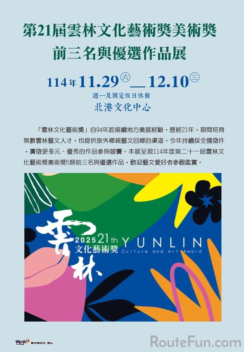 展覽呈現114年度第二十一屆雲林文化藝術奬美術奬5類前三名與優選作品,以及入選與邀請作品,歡迎藝文愛好者參觀鑑賞。「雲林文化藝術獎」自94年起接續地方美展經驗,歷經21年,期間培育無數雲林藝文人才,也提供旅外鄉親藝文回鄉的渠道。今年持續採全國徵件,廣徵更多元、優秀的作品參與競賽。