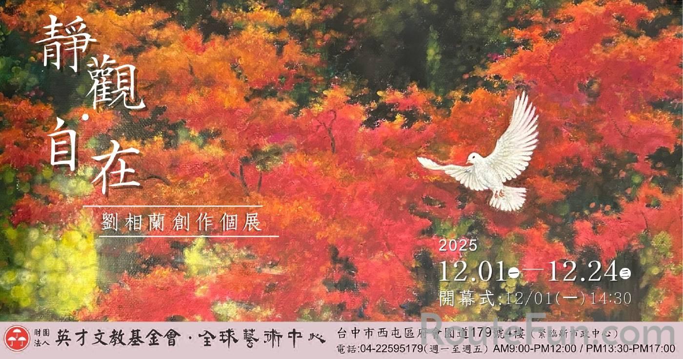 《靜觀.自在》劉相蘭創作個展訂於2025年12月1日至12月24日(周一至周五/例假日休館)AM9:00~PM12:00/PM13:30~PM17:00在財團法人英才文教基金會全球藝術中心展出。劉相蘭老師畫風細緻柔美,並帶有禪意,曾在中部美展、全國油畫展、台陽美展等多次獲選。本展以「自然與心靈的對話」為核心,透過油畫藝術呈現蓮荷、蘭花與佛像等元素,展現自然的靜謐之美與生命的智慧。作品運用油彩層疊的技法,描繪盛放的蓮花、搖曳的荷塘、與安靜沉思的佛像,帶領觀者在視覺與心靈之間,找到寧靜與啟發。我們希望觀者能遠離日常的紛擾,放慢腳步,在欣賞作品的同時,感受平和的藝術氛圍,並獲得心靈的啟迪與力量。
