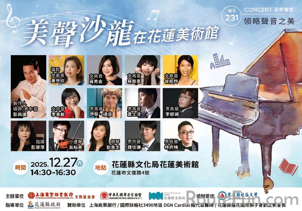 2025第四屆「領略聲音之美」音樂會《美聲沙龍在花蓮美術館》將於2025年12月27日下午14:30在花蓮縣文化局花蓮美術館舉行。由中華民國聲樂家協會偕同花蓮縣文化局共同策辦,邀請14位在地優秀音樂家和聲協聲樂家,運用花蓮美術館中庭和廊道為環境劇場,由彭興讓教授擔任節目製作人,劉惠芝教授擔任伴奏,彭翠萍教授擔任合唱指揮,吳柏熹教授擔任小提琴助奏,演唱流行歌謠、世界名曲、經典歌劇及藝術歌選粹等。