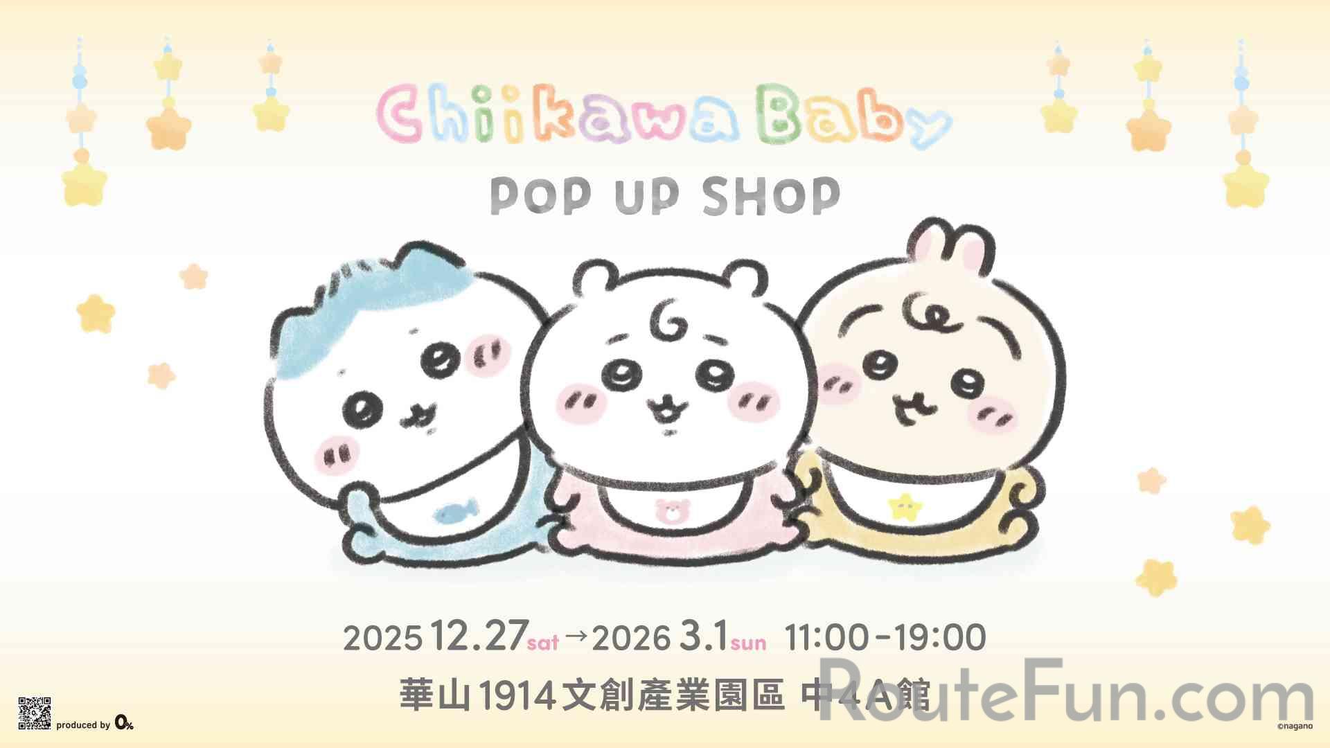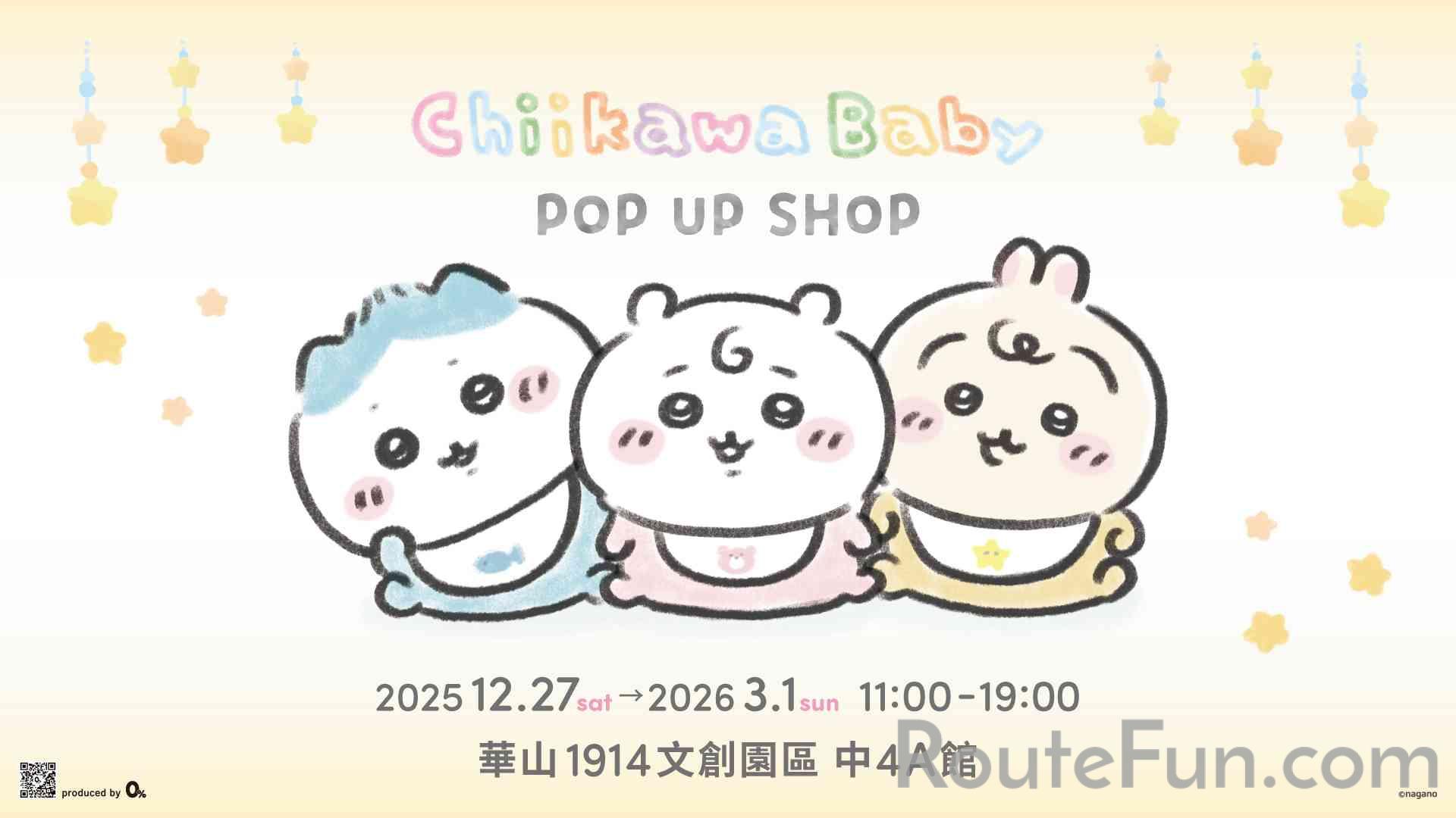 Chiikawa Baby系列首次海外亮相!快閃店將於2025年12月27日(六)至2026年3月1日(日),在華山1914文化創意產業園區中4A館夢幻登場,邀請大家一同體驗這場可愛度破表的寶寶盛宴!打卡亮點:融化人心的立體公仔與場景吉伊卡哇、小八貓與兔兔化身為立體公仔,無論是坐在小鴨馬桶或穿著包屁衣的造型,保證瞬間融化所有煩惱!不管是「爬爬造型牆」展現角色們超萌屁屁,或是隱藏在角落的角色Baby模樣日常,等待粉絲來發掘!獨家商品:Baby系列一次滿足 Baby 系列商品一應俱全!從造型吸睛的嬰兒服玩偶吊飾、可以緊抱的襁褓玩偶,到討論度極高的「包著高麗菜的兔兔吊飾」,玩偶到日用品一次滿足。讓我們一同沉浸在Chiikawa Baby專屬的可愛氛圍,感受這股最溫暖、最療癒的魅力!