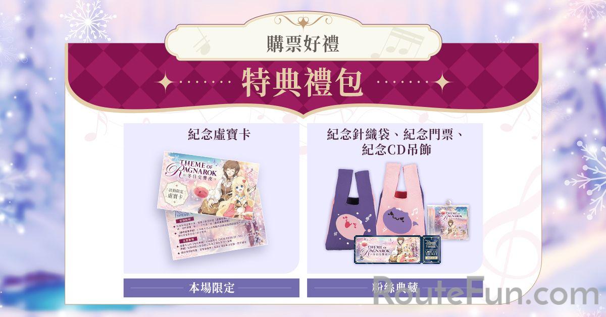 凡購票並於當日持票入場者,不限票價皆可兌換特典禮包乙份,內容包含:「紀念魔物針織袋」、「紀念 CD 吊飾」、「紀念門票」及「RO 虛寶卡」。