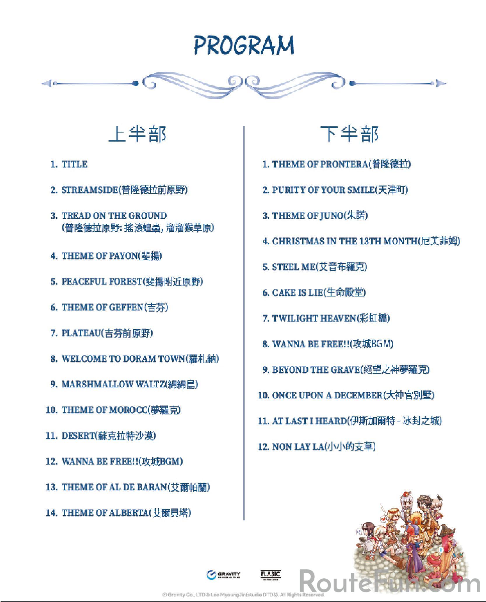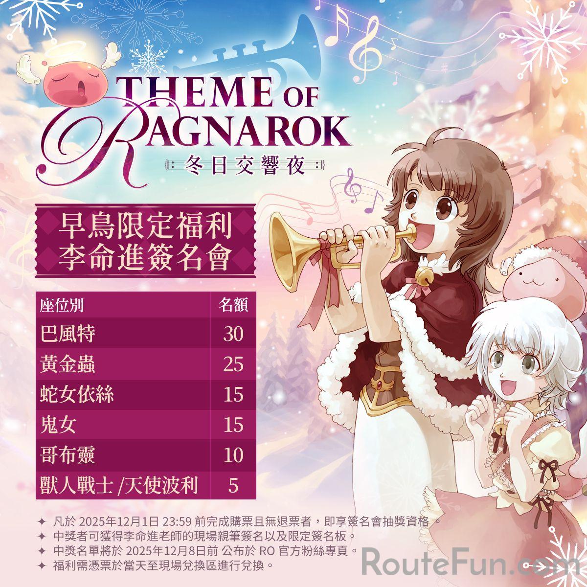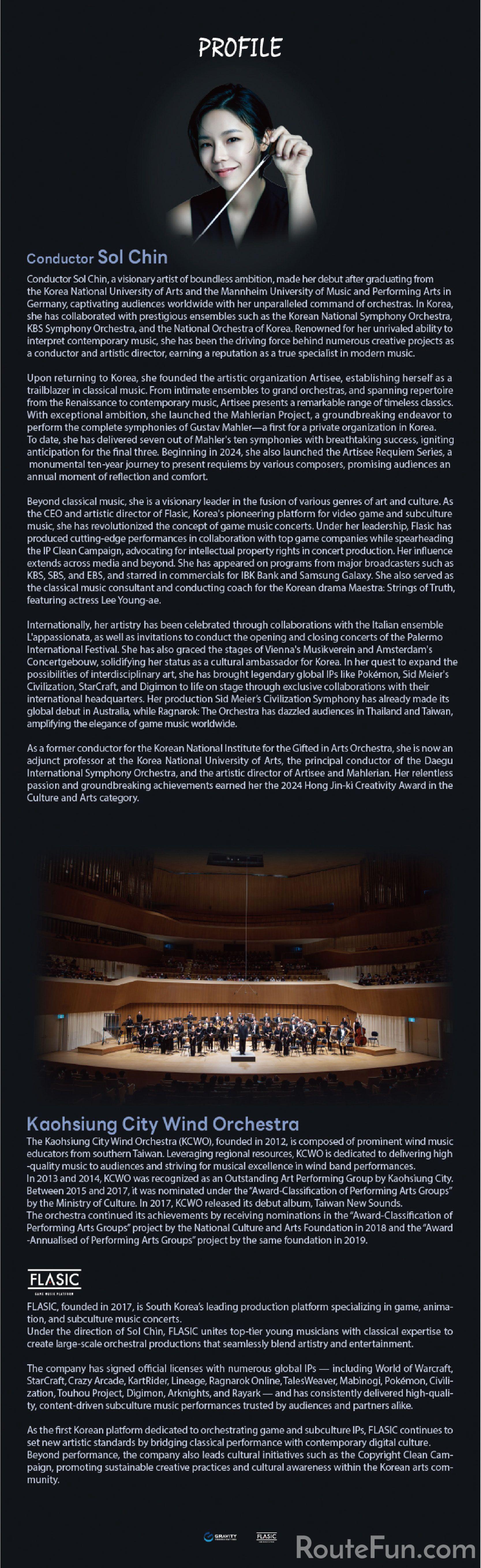 《RO仙境傳說》THEME OF RAGNAROK 將帶來全新篇章,由 高雄市管樂團、六藝樂集現場演繹《Theme of Prontera》《Streamside》《Title》等超過二十首經典樂曲,FLASIC 擔任本次音樂會的新編曲製作,特別以拉丁風格重新編曲四首RO經典旋律,以熱情節奏與交響層次交織出耳目一新的冒險樂章,邀您共度這場屬於冒險者的冬日交響夜。