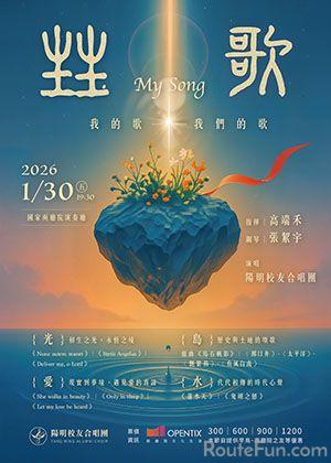 陽明校友合唱團《甡歌MY SONG – 我的歌,我們的歌》,以{光}、{愛}、{島}、{水}四種純粹且充滿生命力量的元素,採取四組連篇歌曲的形式,以文學為經、詩歌為緯,歌詠萬物的誕生與消逝、愛的圓滿與缺憾、成長的掙扎與和解。曲目包含《Nunc autem manet》、《Stetit Angelus》、《Deliver me, o Lord》、《She walks in beauty》、《Only in sleep》、《Let my love be heard》、《鬼湖之戀》、《烏石帆影》組曲等。演出團隊:指揮|高端禾,鋼琴|張絜宇 ,演唱|陽明校友合唱團。