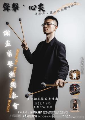 謝孟甫擊樂獨奏會,將呈現 13 首作品,其中 6 首為臺灣首演。演出曲目包含Gene Koshinski(吉恩・柯辛斯基):《京劇印象 III:打》(Impressions of Chinese Opera III: Da);Qingqing Teng(滕晴晴):《老螃蟹》— 給兩面中國小鈸與電子音樂(Vieux crabe for two Chinese cymbals and electronics)(臺灣首演);Pius Cheung(張鈞量):《f 小調夜曲》(Nocturne in f